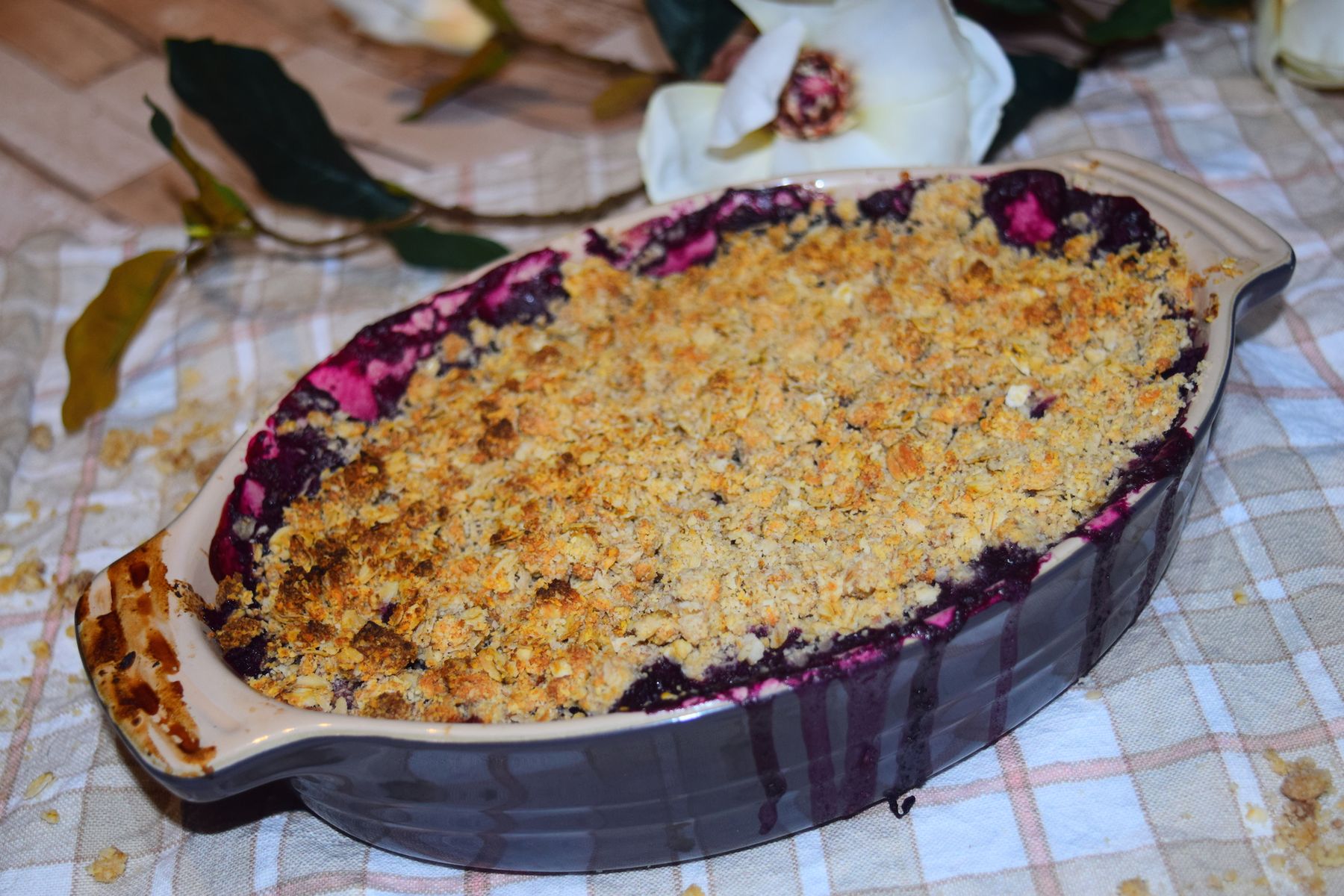 I just love the vibrancy of the purple berries, not only does it taste fantastic – it looks it too. The crumble topping, made from oats (you can also use gluten-free oats if you’re intolerant) and ground almonds soaks up all the juiciness of the berries when baked, which make every single bite juicy, flavoursome and delicious. I’ve used a mixture of blueberries, strawberries and raspberries to make this, but other alternatives such as; rhubarb, apples and blackberries are also super tasty.