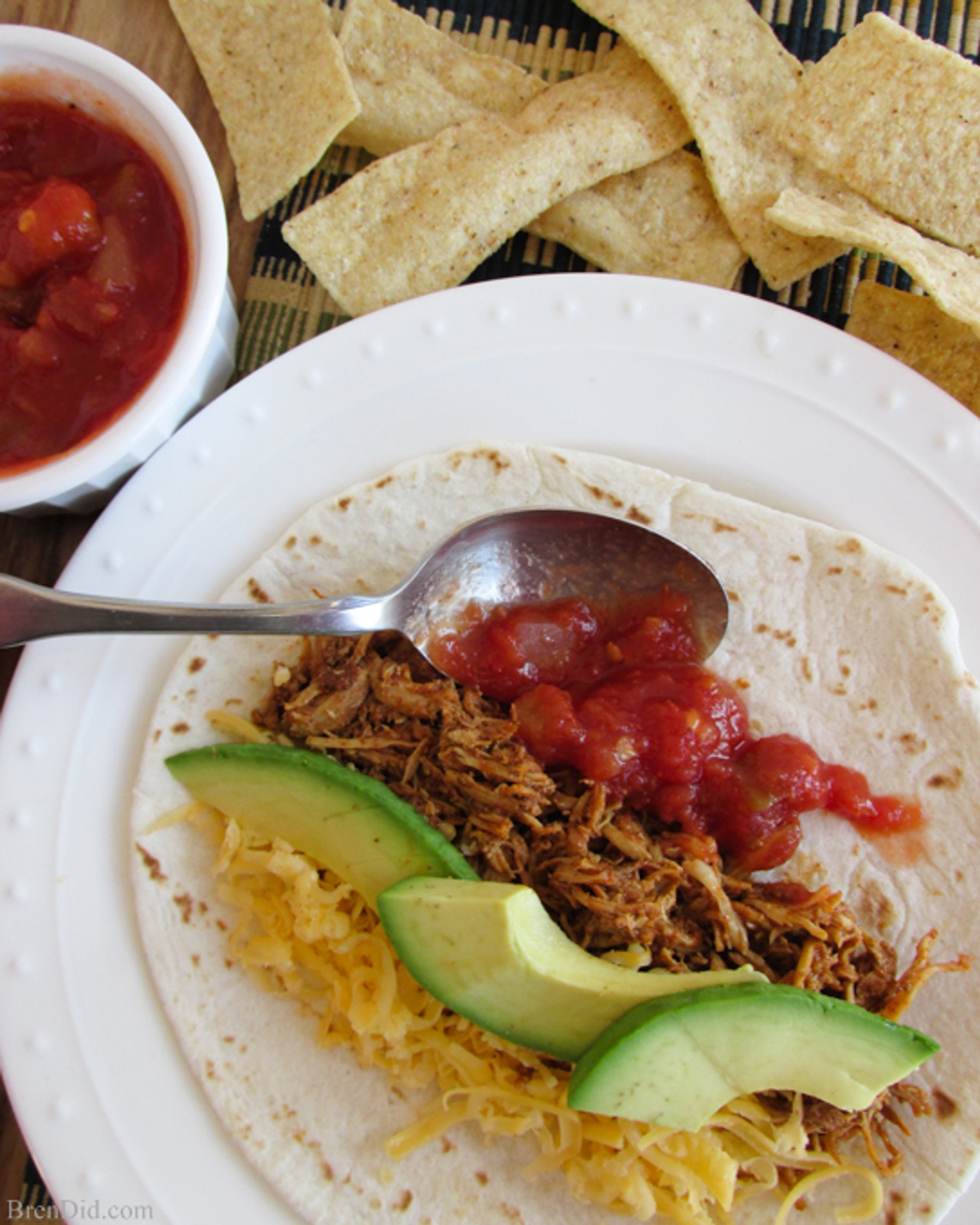 I also love “dump and cook” chicken crock pot recipes. “Dump and cook” is my affectionate term for crock pot recipes that require very little preparation but still produce tasty results. This recipe for chicken tacos meets both requirements. As an added bonus, it eliminates the high sodium levels and mystery ingredients found in taco seasoning packets making them a healthy dinner choice.