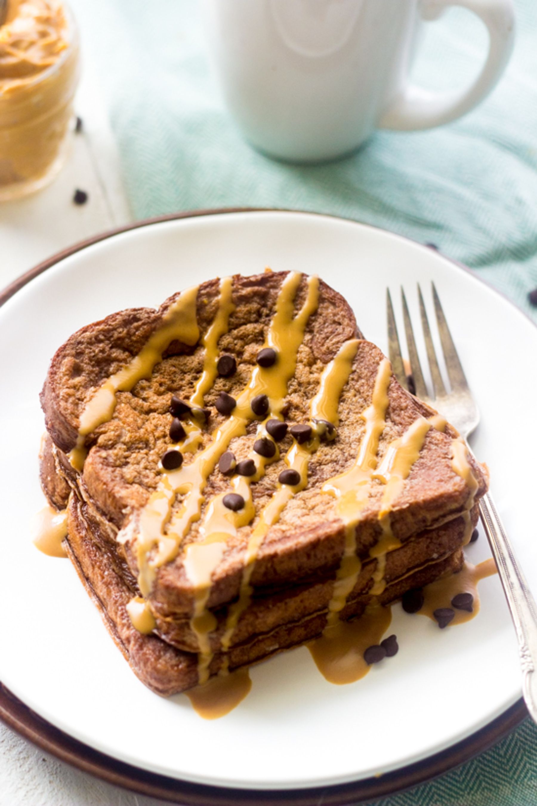 This healthy french toast recipe is very high in protein and so quick, easy and LOADED with chocolate and peanut butter! Your new favorite breakfast!