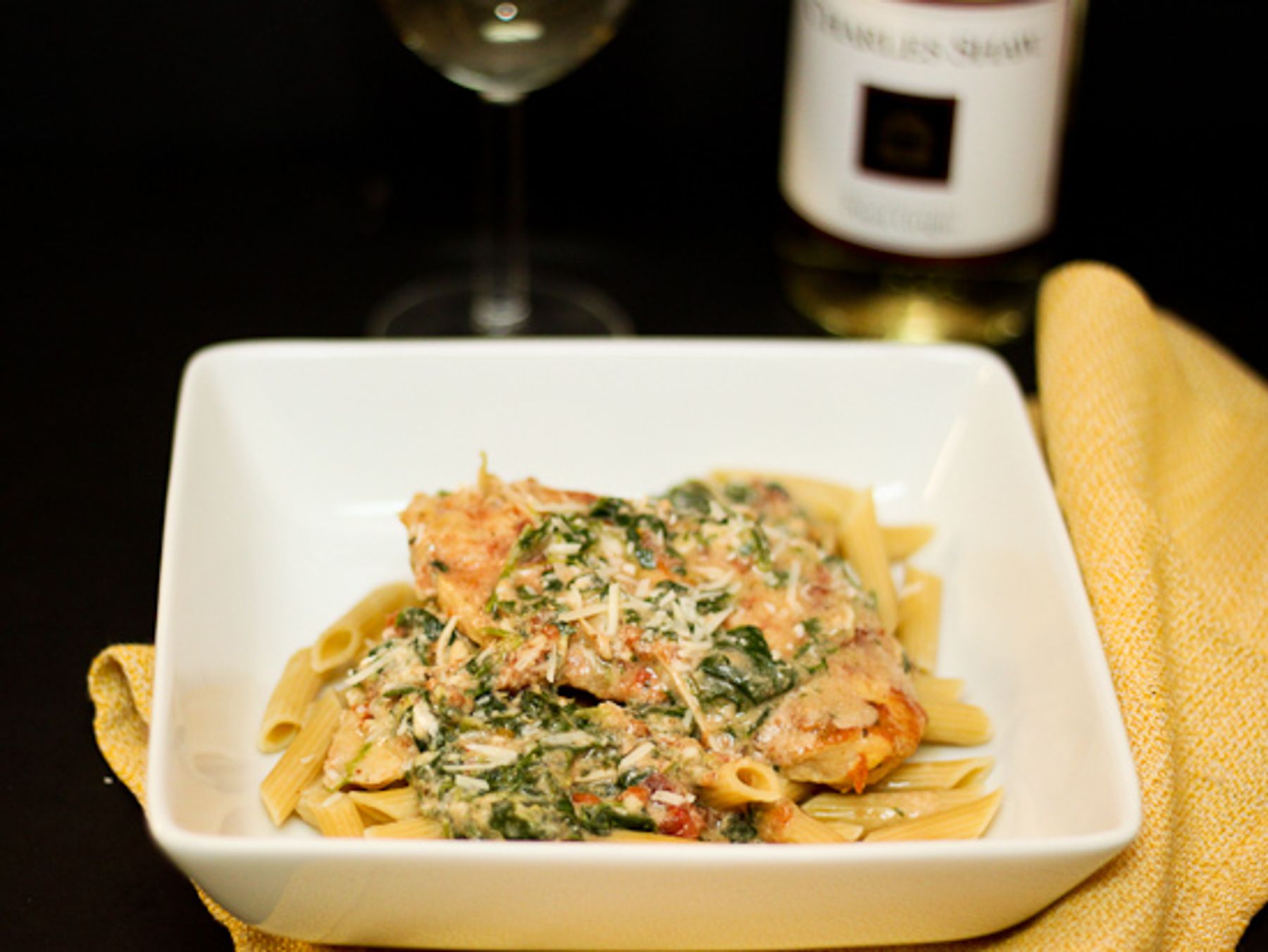 Creamy crockpot chicken with no cans of cream of anything soup. Great served over pasta or rice.