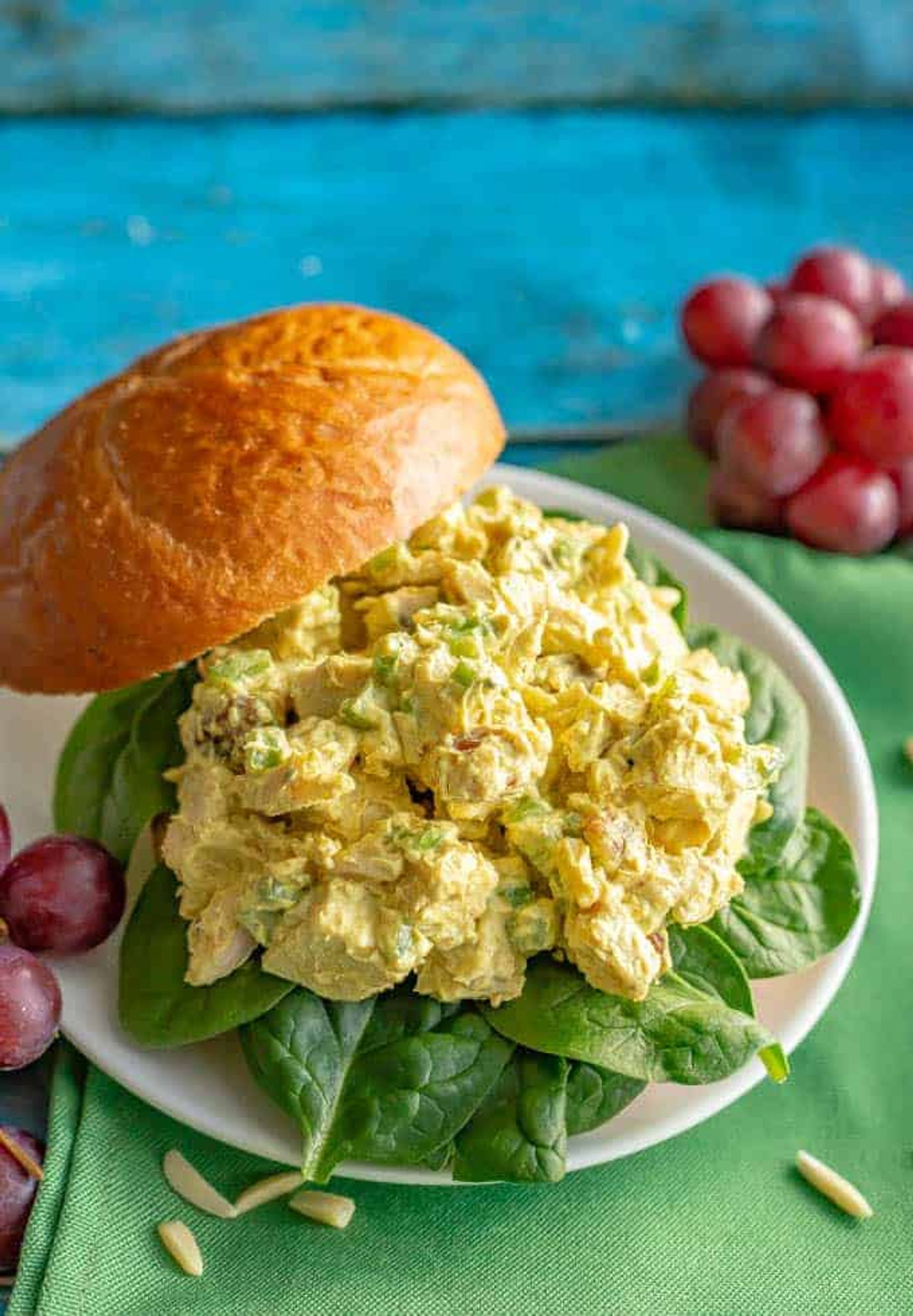 Healthy curry chicken salad is perfectly creamy and oh so flavorful. Serve as a sandwich, wrap or salad for a delicious, healthy lunch!