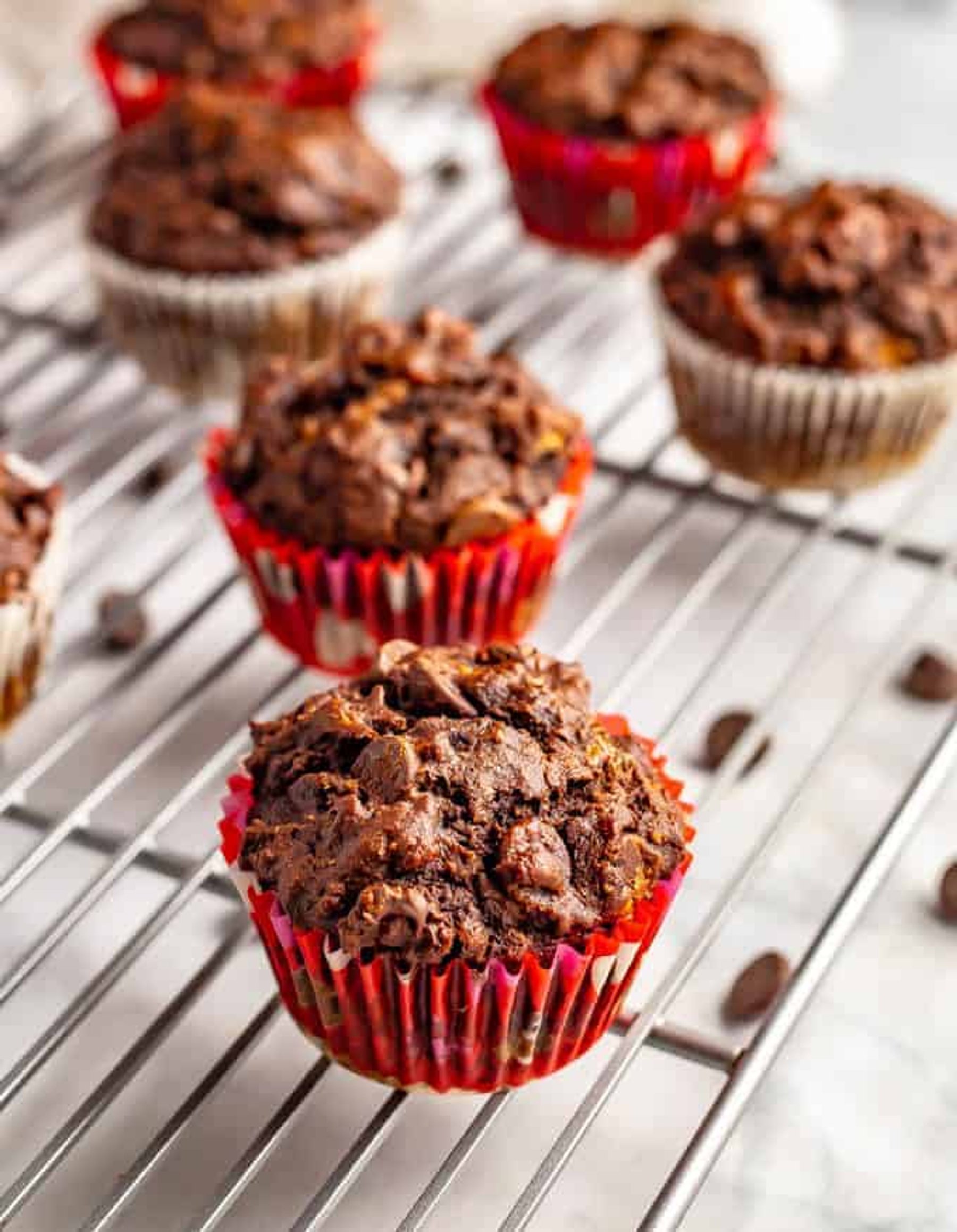 Double chocolate banana muffins are moist, full of melty chocolate chips and perfect for snacking! And they’re whole wheat and naturally sweetened.