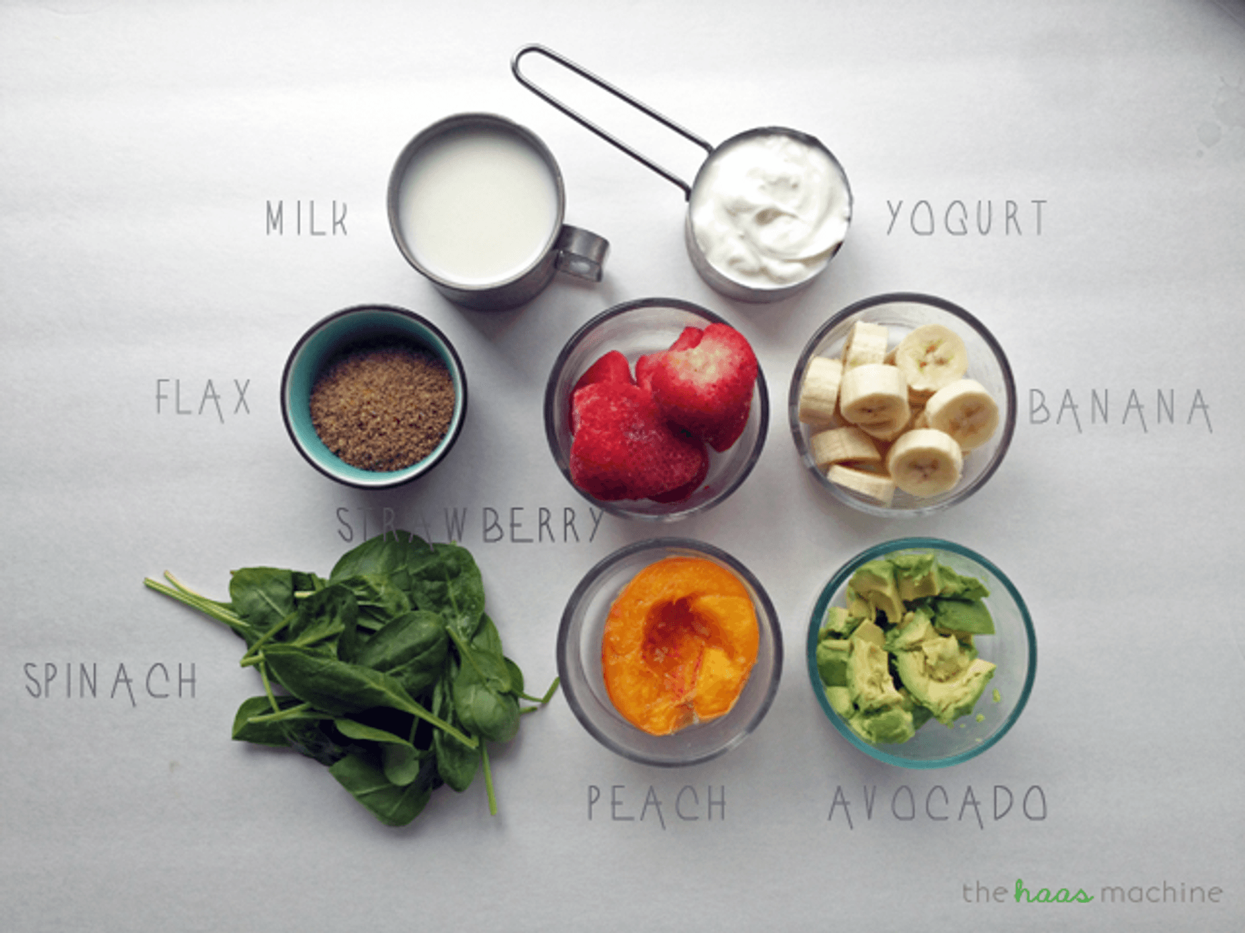 Add all of the contents into the blender & blend away. It is helpful to add a bit of fruit, then a bit of milk, then more fruit, etc. so that it blends easily.