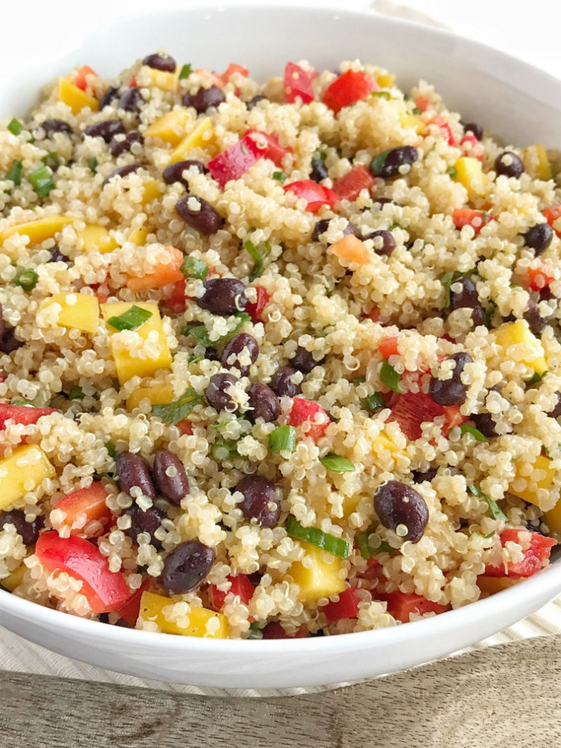 Mango black bean quinoa salad is a light, healthy, and filling salad. Hearty quinoa and black beans, sweet mango, crisp red peppers, green onions, and cilantro all covered in an easy olive oil vinaigrette dressing. It’s also great for lunch too!