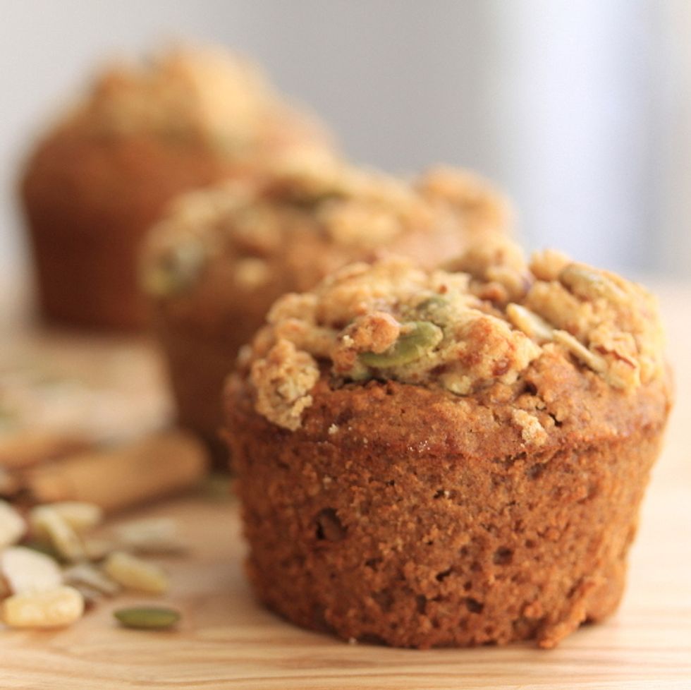Cinnamon muffins, made healthier using wholemeal flour, dates and coconut sugar for sweetness and trail mix to add some crunch. By Sugar Salt Magic