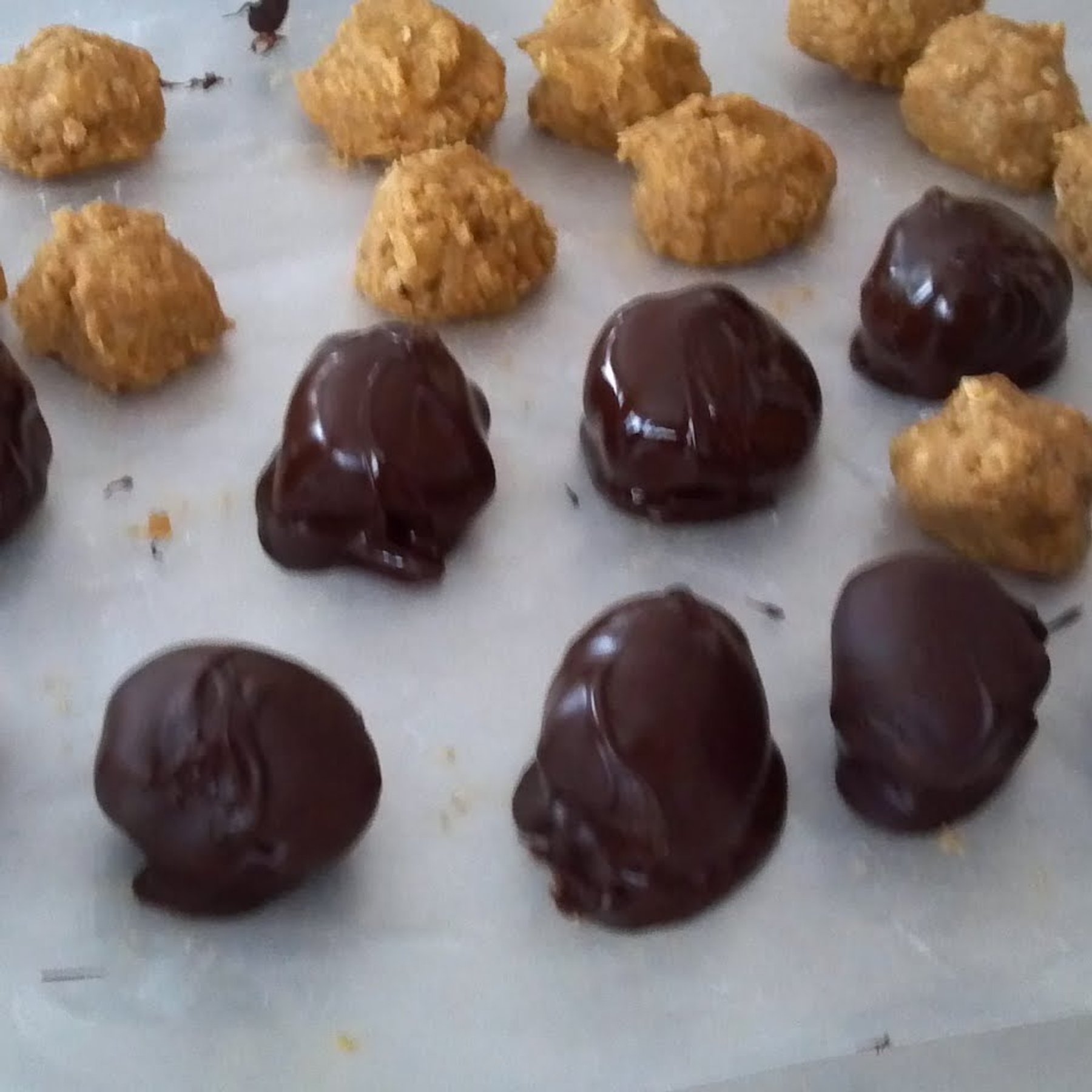 Mix together honey, peanut butter, and oatmeal. Roll into 1 inch size balls and place on parchment lined cookie sheet. Place in freezer for an hour. Melt chocolate. Remove peanut butter balls from freezer and coat in chocolate, place back on parchment paper. Allow to set, return to fridge in airtight container. Enjoy!