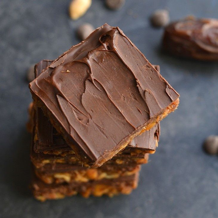 3 Ingredient Peanut Butter Chocolate Chip Bars! They taste like candy, but are secretly good for you! Sweetened with dates, these simple no bake bars easy to make and kid friendly. Vegan, Gluten Free + Paleo Option
