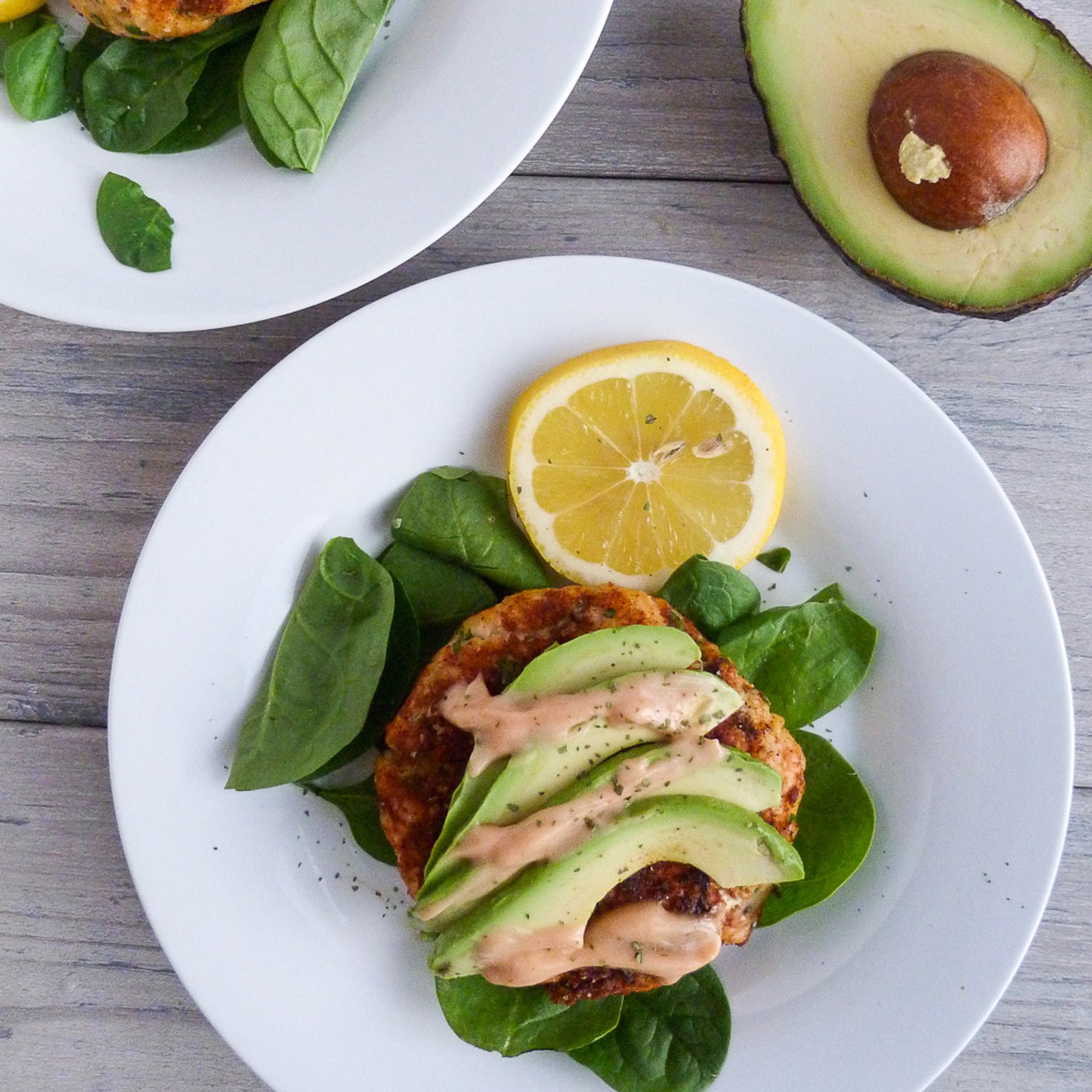 Healthy Salmon Cakes in 20 Minutes to crush your evening meal prep blues. Top them off with avocado slices because it makes for the perfect flavor combo and the sriracha mayo gives them just the right kick!