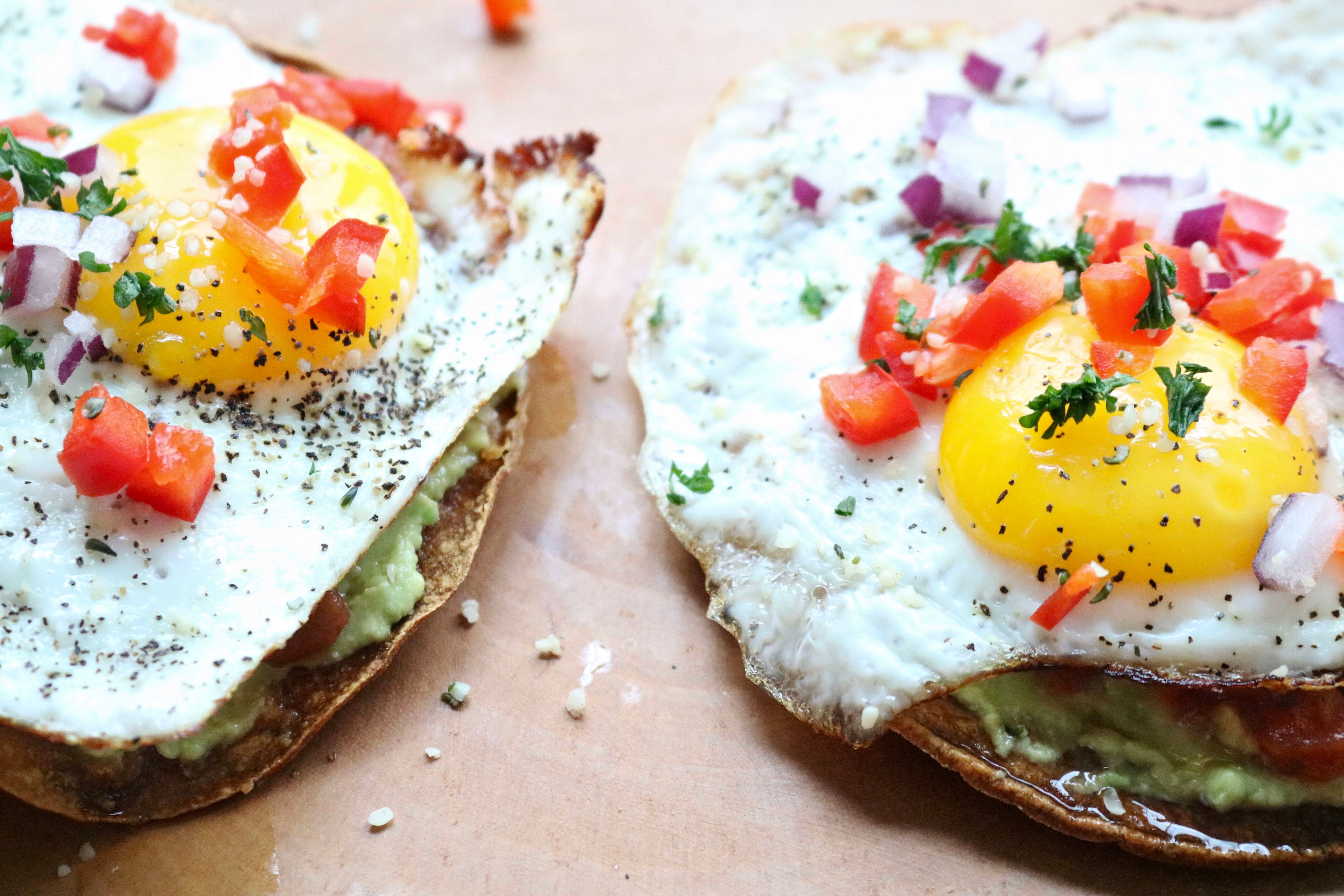 Healthy southwestern breakfast tostadas! Perfectly crispy tortillas topped with fresh guacamole, tomato salsa, a peppery fried egg and nutritious hemp seeds. A great way to jump start your day! Vegetarian and gluten free!