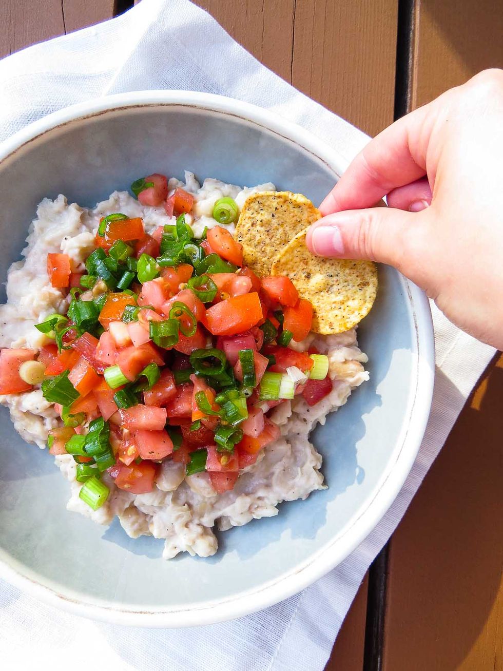 Hearty white cannellini beans mashed to a rustic hummus-like dip are topped with fresh tomatoes and scallions to make this yummy recipe! A perfect appetizer, snack, or lunch!