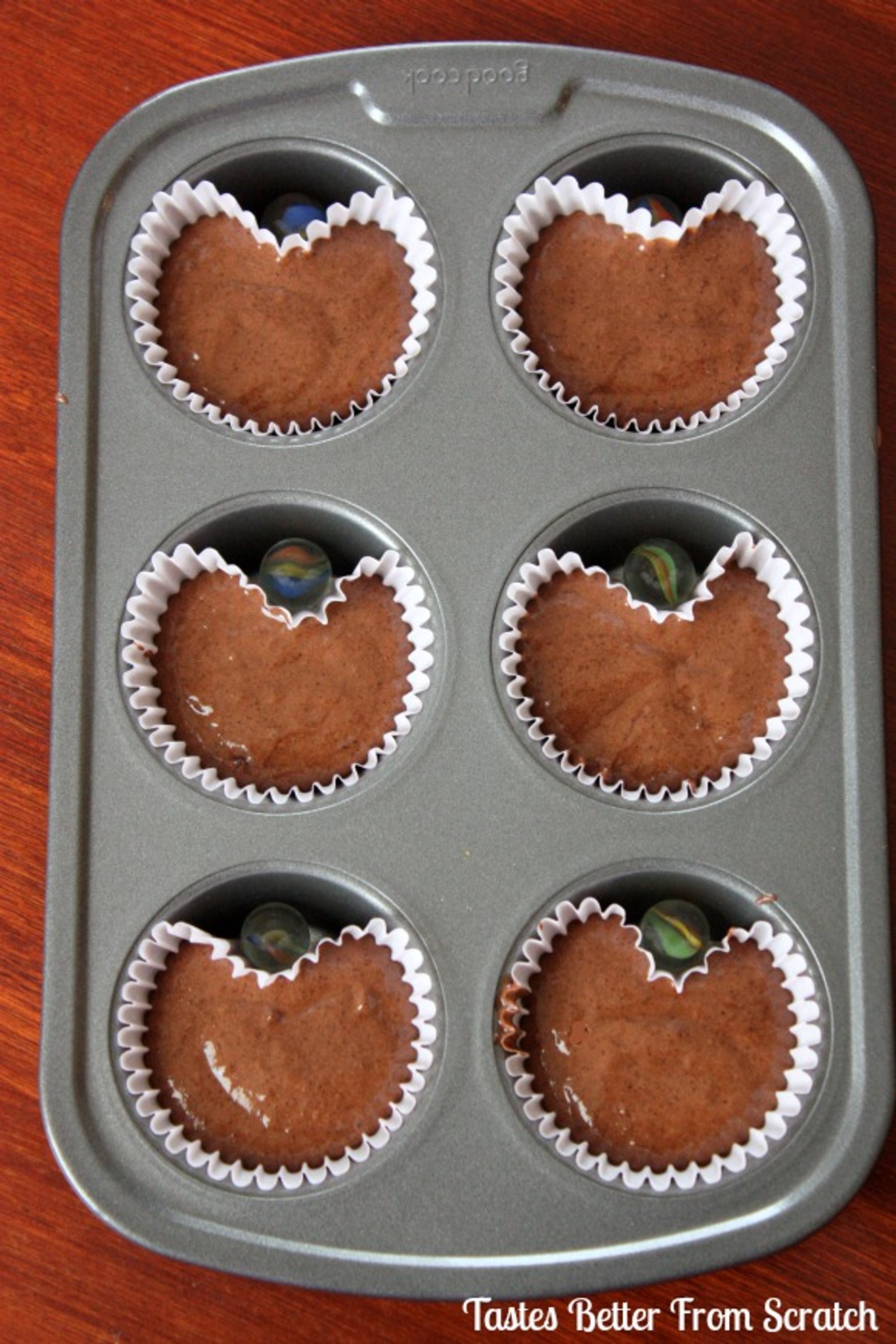 Make adorable heart shaped cupcakes with a regular muffin tin and some marbles!