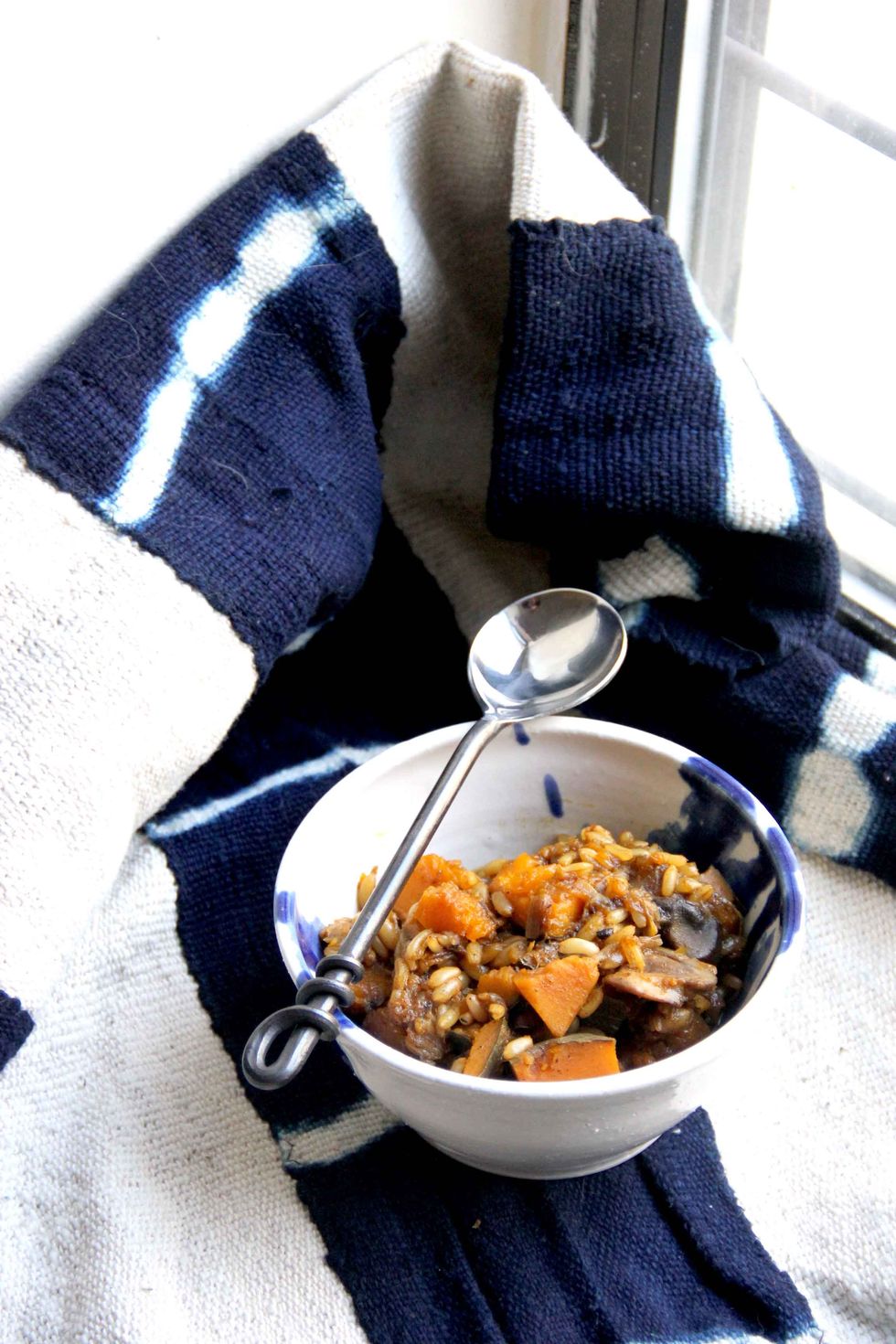Heat oil in a medium-sized dutch oven (or pot). Slice leek into rounds and toss into pot. Cook on medium heat for 5 minutes until leek has softened. Add kamut, 2 cups of water and stir in black garlic...