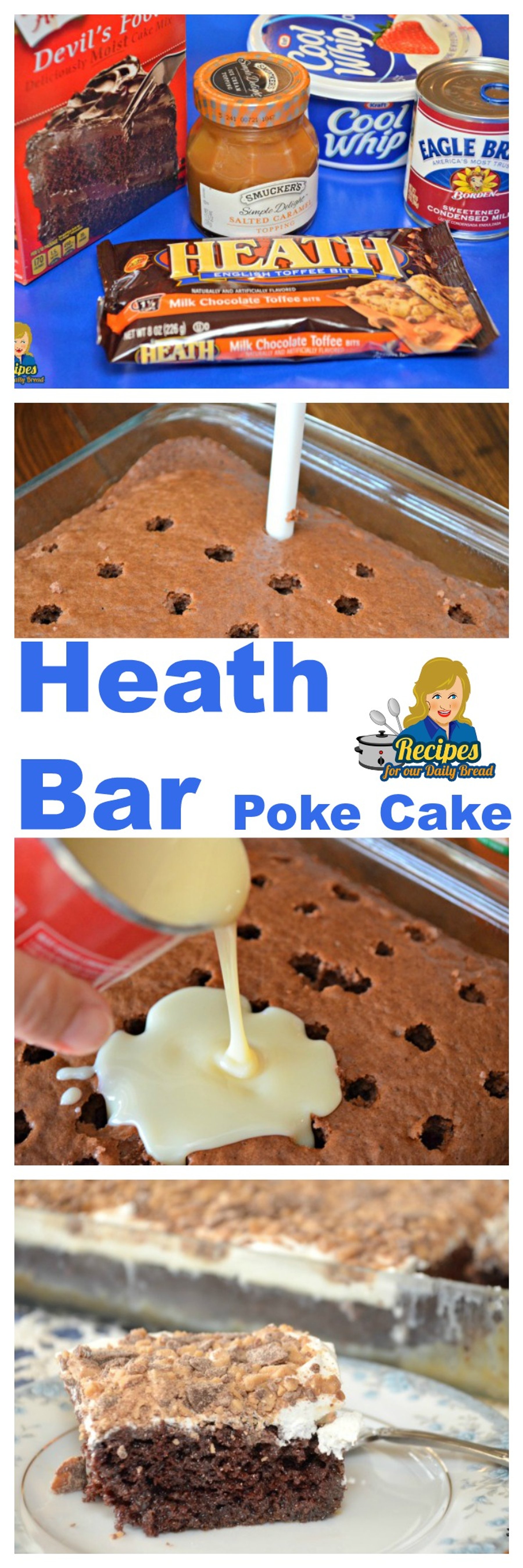 Are you looking for an easy cake made with a cake mix? If you enjoy making an easy dessert that everyone will love, this Heath Bar Cake is for you? What is in this Heath Bar Cake? Chocolate Cake Mix, Sweetened Condensed Milk, Salted Caramel, Whipped Topping and crushed Heath Bars.