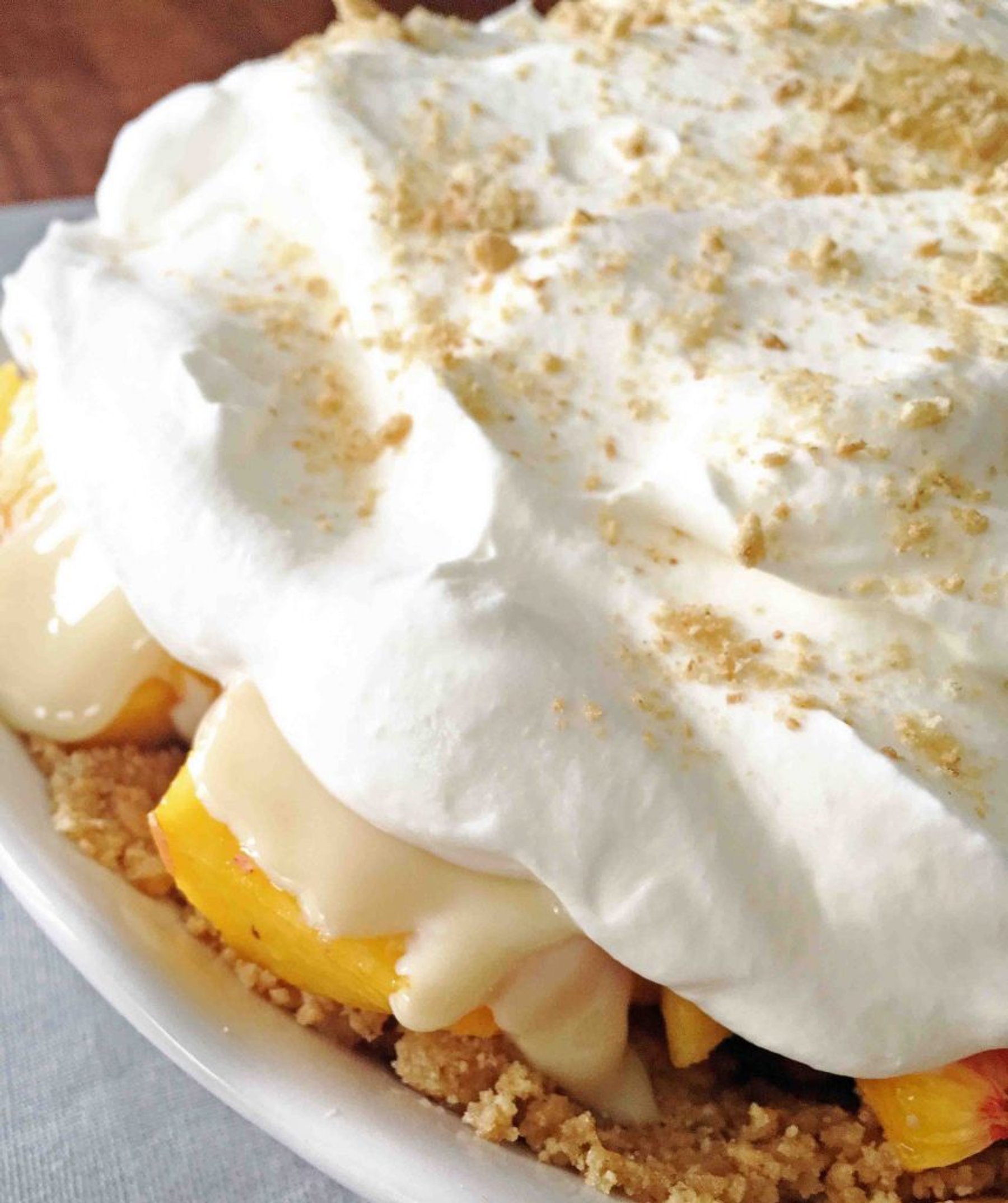 This Fresh Peach Dessert (or no bake fresh peach pie) is amazing! A graham cracker crust filled with fresh peaches and then topped with sweetened condensed milk and whipped.