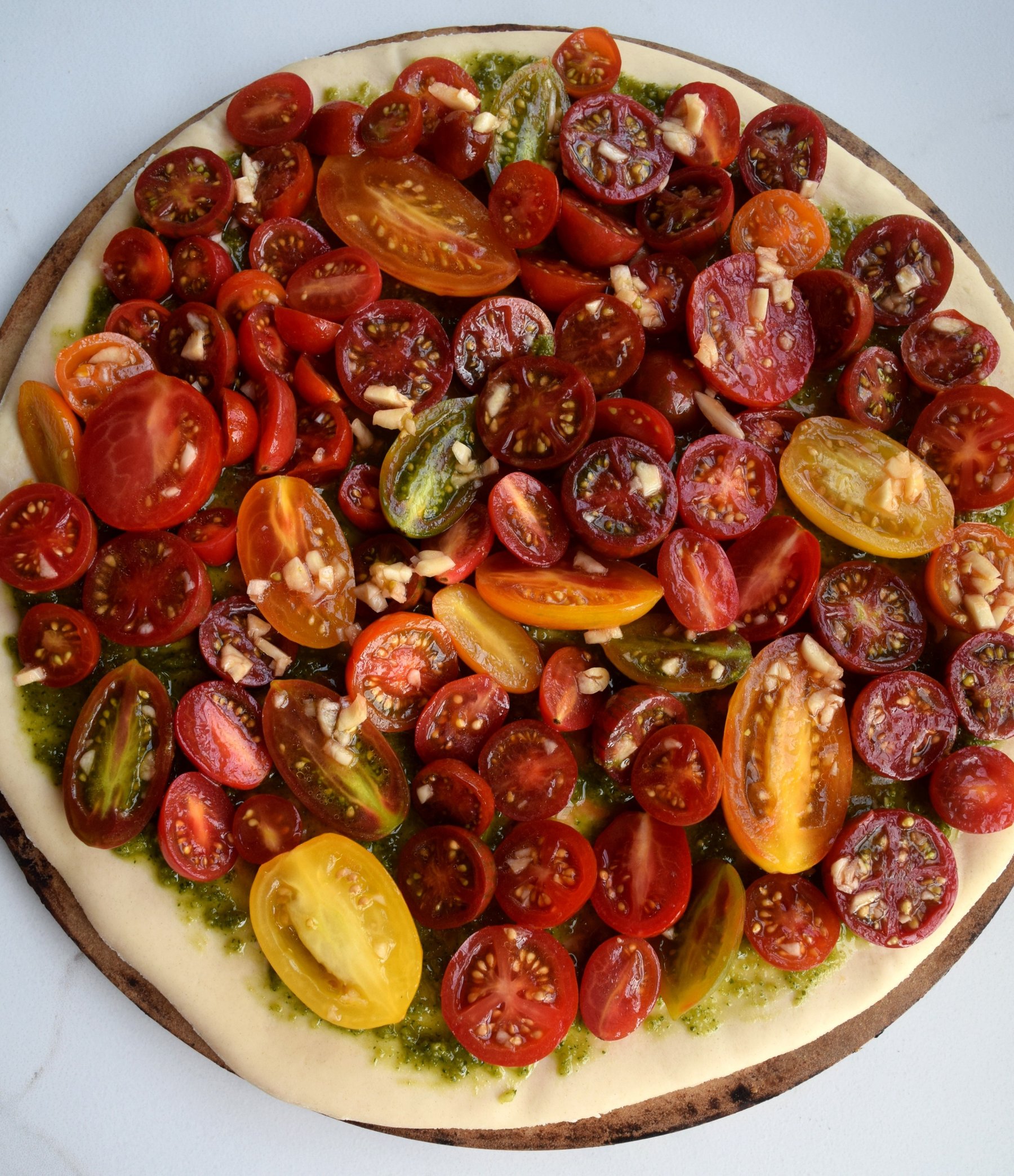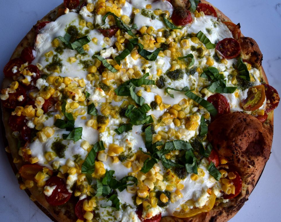 1.Preheat oven to 425 2.Stretch dough over a pizza stone or baking sheet 3.Spread pesto over the dough 4.Add tomatoes, top with mozzarella, goat cheese, and corn 5.Drizzle remaining pesto over the top...