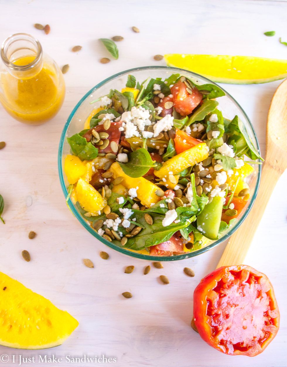 A summer salad of heirloom tomatoes, watermelon, toasted pepitas, feta and arugula. Perfect for enjoying warm summer days.