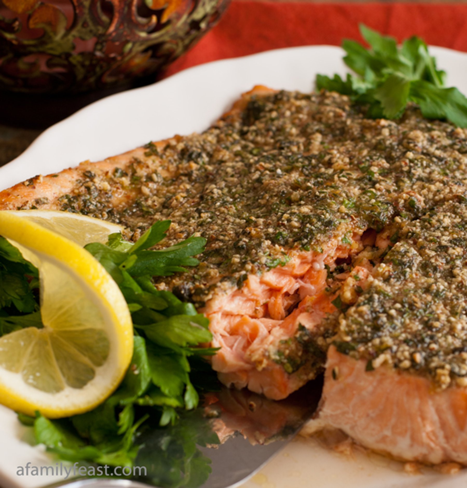 Fresh parsley, basil, butter, olive oil, lemon zest and finely diced, toasted almonds were combined into a simple paste that was spread over the salmon before baking. The salmon was melt-in-your-mouth tender with wonderfully fresh flavors that complemented the salmon so perfectly. Not only is this recipe delicious, but it’s also very easy to prepare. Whether you are serving it for a family meal or a dinner party, your dinner guests will love it!