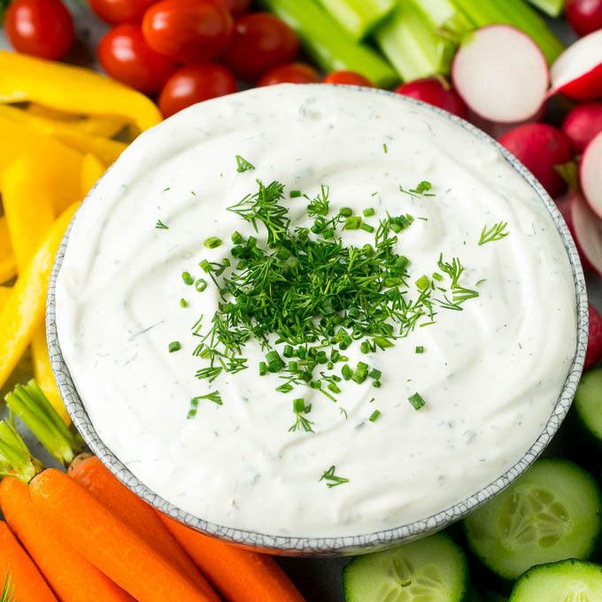 This veggie dip is loaded with garlic and herb flavors and pairs perfectly with a variety of fresh vegetables. This vegetable dip takes just 5 minutes to make and is great for parties and potlucks!