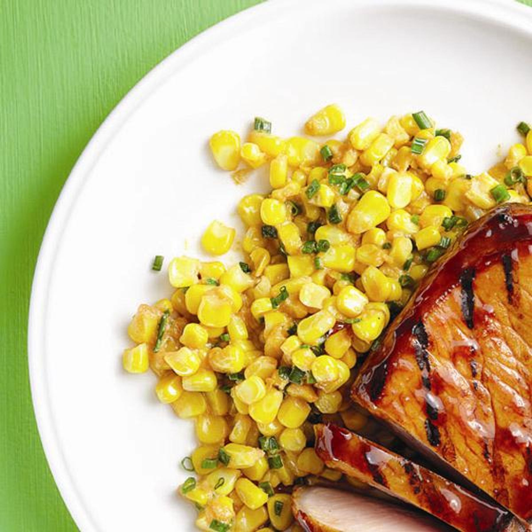 Melt butter with miso in a large frying pan set over medium. Add corn. Cook, stirring occasionally, until corn is tender and warmed through, about 5 min. Stir in chives. Serve immediately with Simple sweet & sour pork.