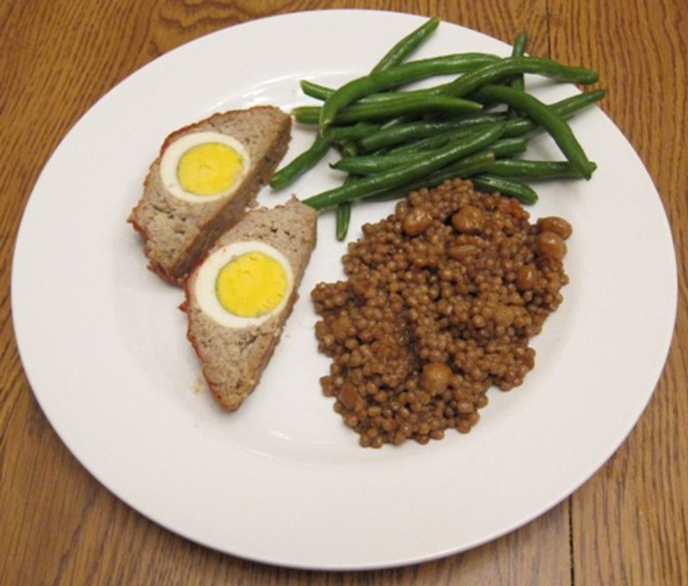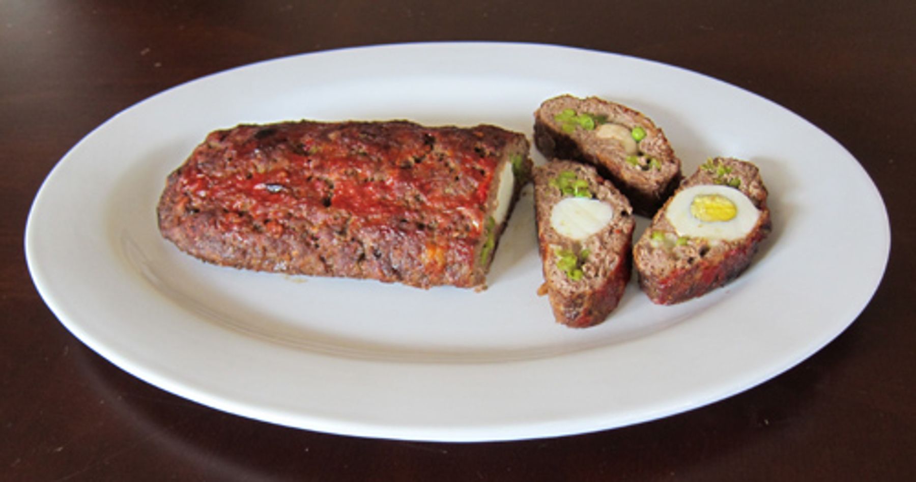 This meatloaf has hardboiled eggs baked inside the meat. When you cut this meatloaf into slices, the slices will have the egg surprise inside! Making stuffed meatloaf is easy – just boil the eggs first, peel the eggs, put them inside the meatloaf mixture and bake.