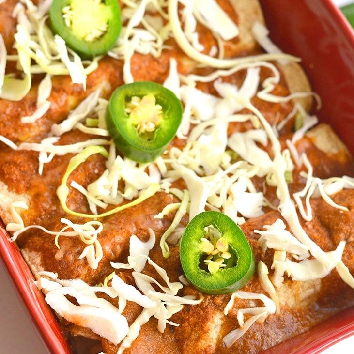 High Protein Chicken Enchiladas! These skinny enchiladas are made with a few simple, healthy swaps. They are creamy on the inside and spicy on the outside. Only 320 calories per serving and made with real food! Gluten Free + Low Calorie