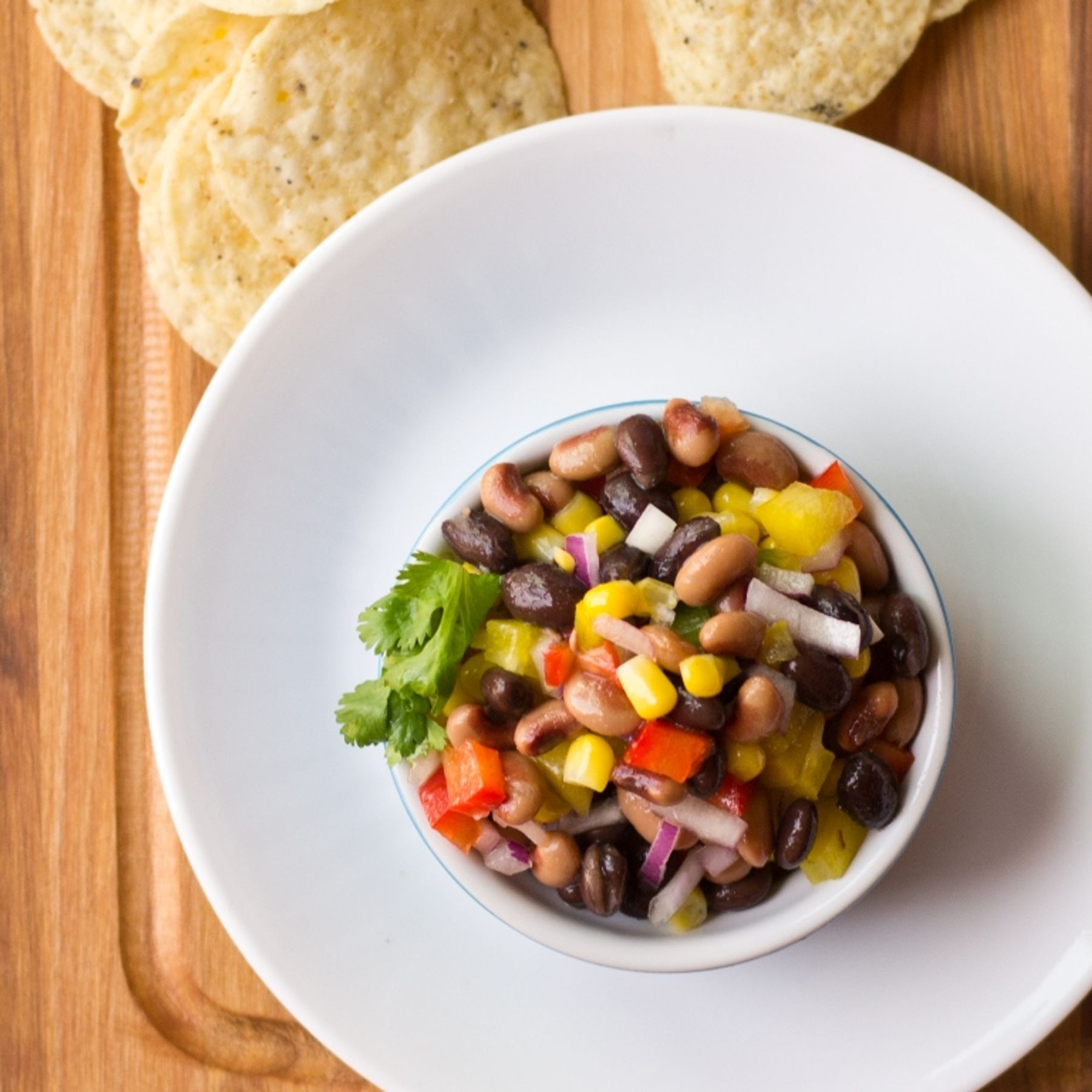 Beans, peppers, onions, & corn with a sweet & tangy dressing. This colorful salad is perfect with tortilla chips!