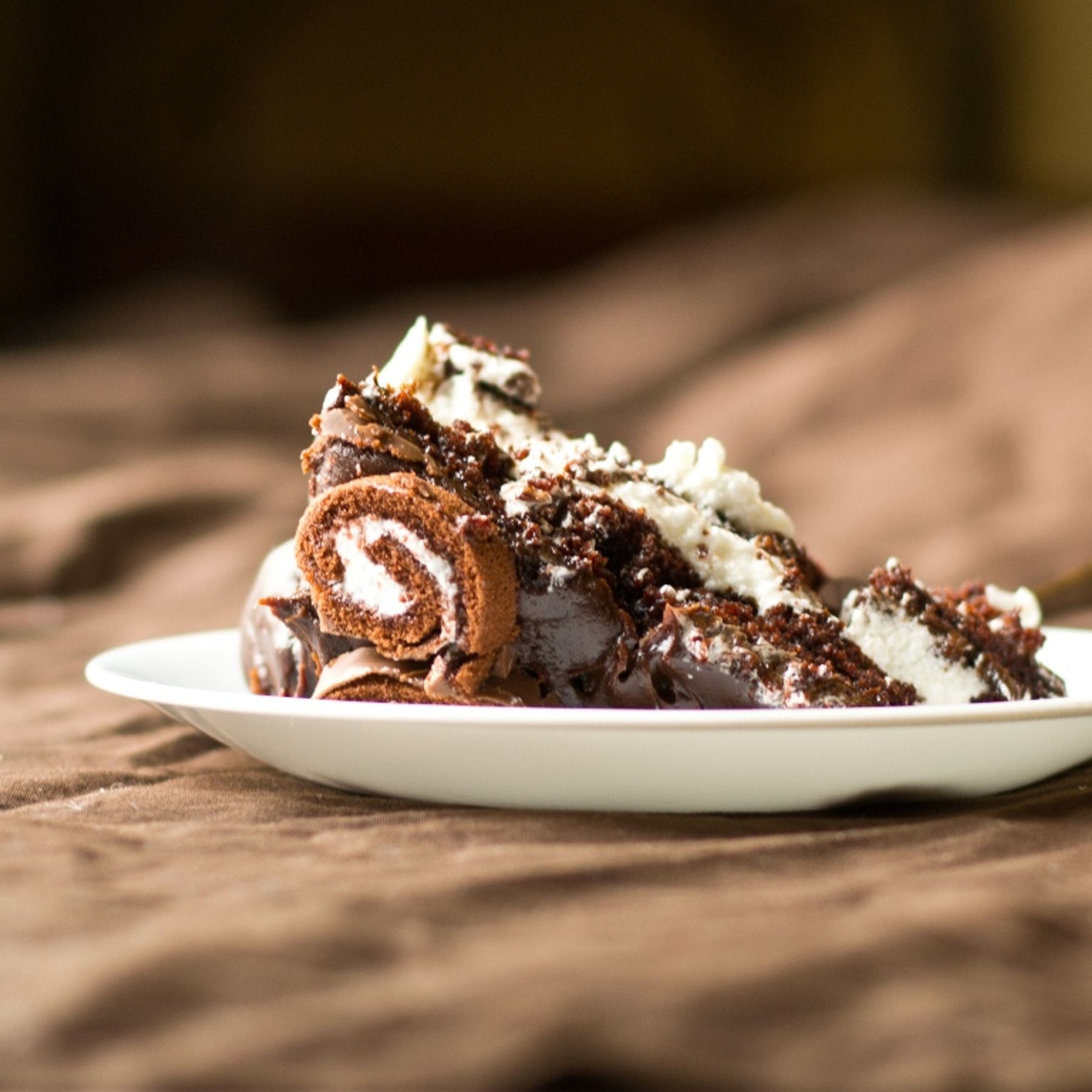 Moist Chocolate Cake with creme filling and chocolate ganache. Decorated with Swiss Cake Rolls!