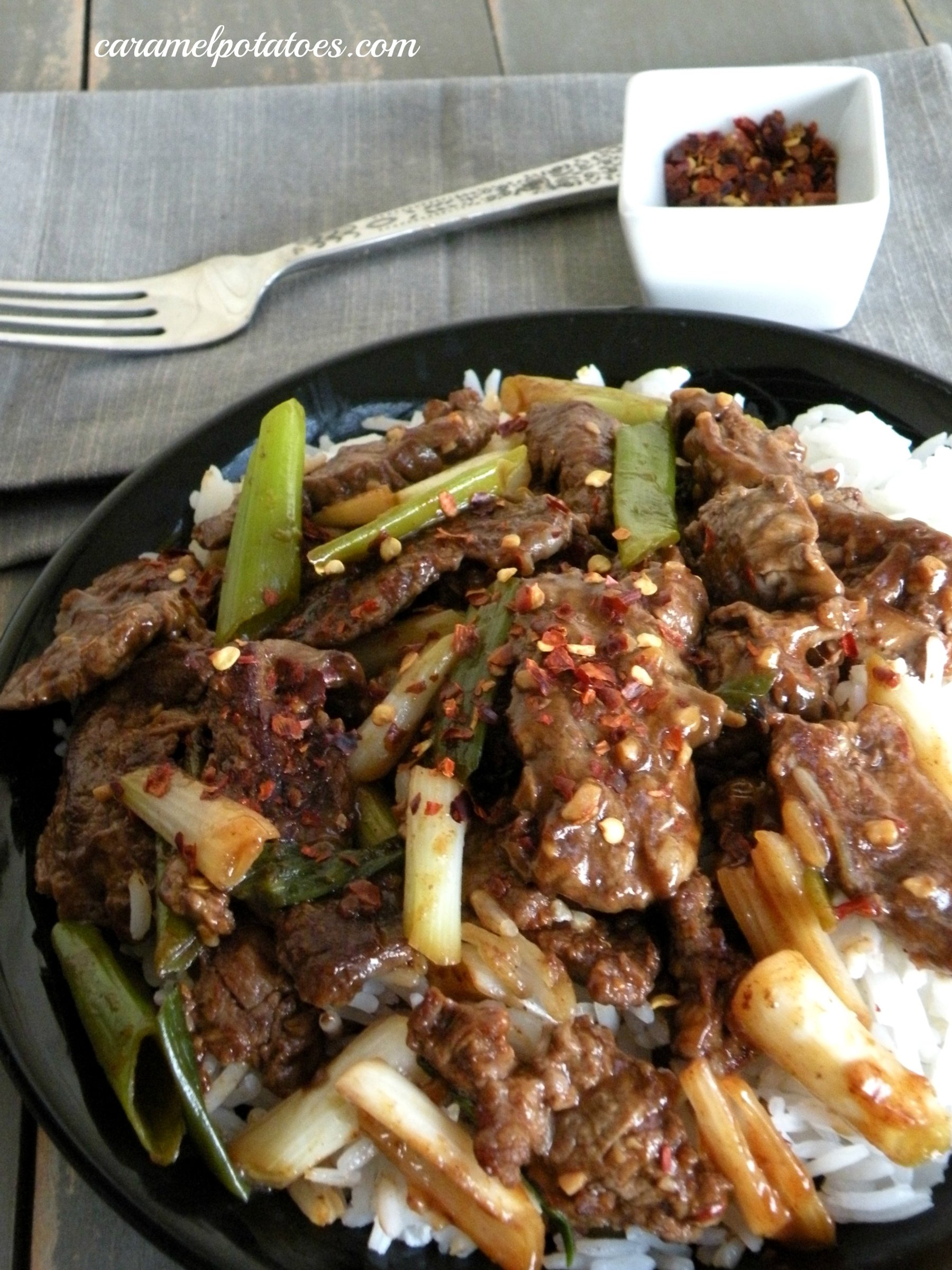This stir fry is simple and good. Thin sliced flank steak and scallions; hoisin sauce has a rich, sweet flavor – you can find it in the Asian section of your market.