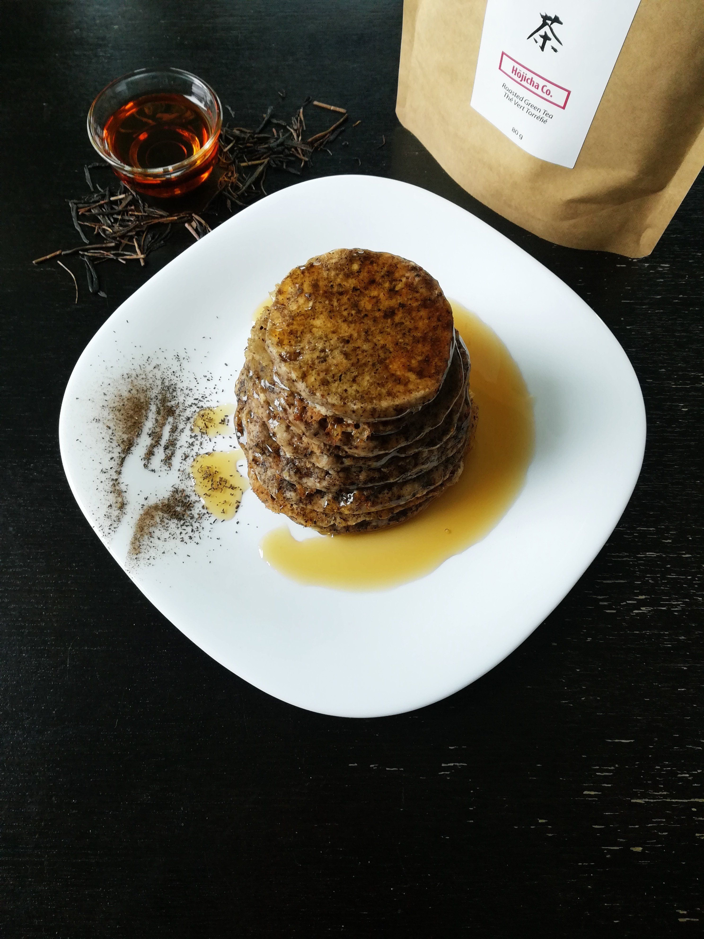 Plant-based Hojicha Maple Pancakes made with freshly ground roasted green tea powder from Kyoto, as well as pure Quebec maple syrup.
