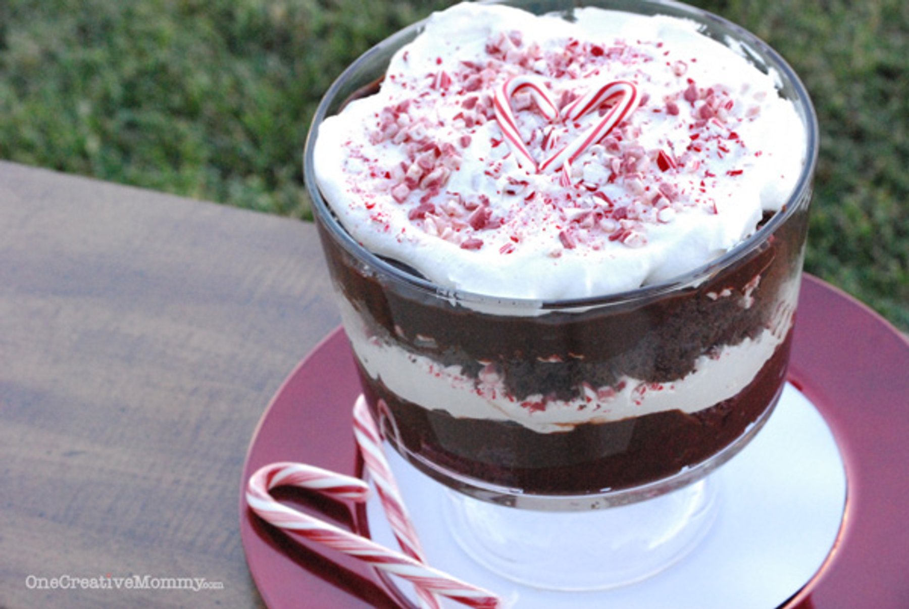 Cut cooled cake into cubes. Cover the bottom of your bowl with cake pieces. Top with 1/2 of the pudding. Top with up to 1/2 of the whipped topping. Sprinkle with candy cane and Andes peppermint bits (up...