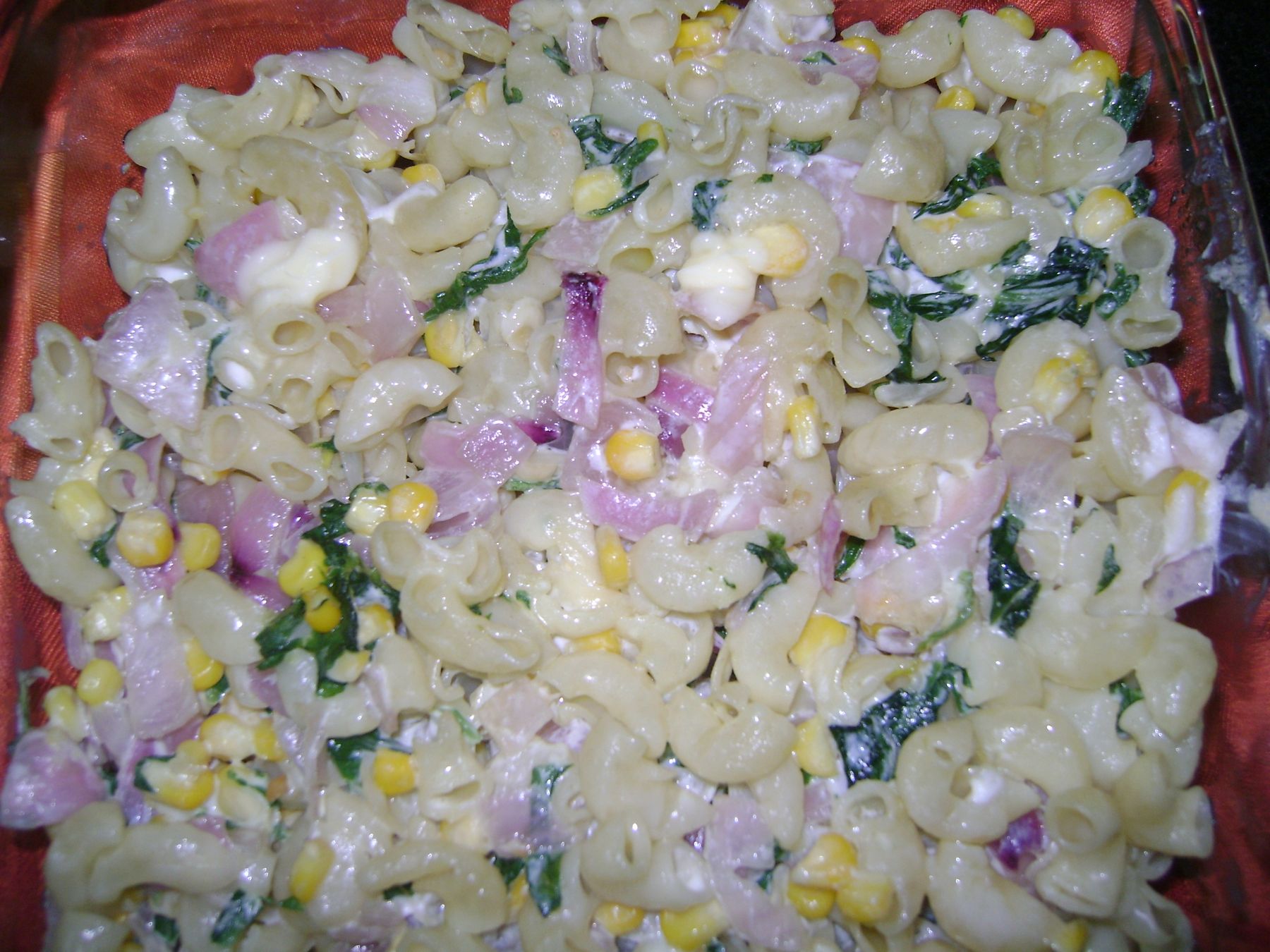In nonstick pan, heat 2 big spoons of butter, add onion and fry for 4 to 5 minutes. Then add corn and spinach, saute for a minute. In a large bowl mix onion corn mixture, pasta, cream cheese, cream, salt and pepper. Mix it well. Preheat microwave oven. Grease a microwave safe glass dish. Pour the pasta mix into the dish, and bake it for 15 minutes. Its done.