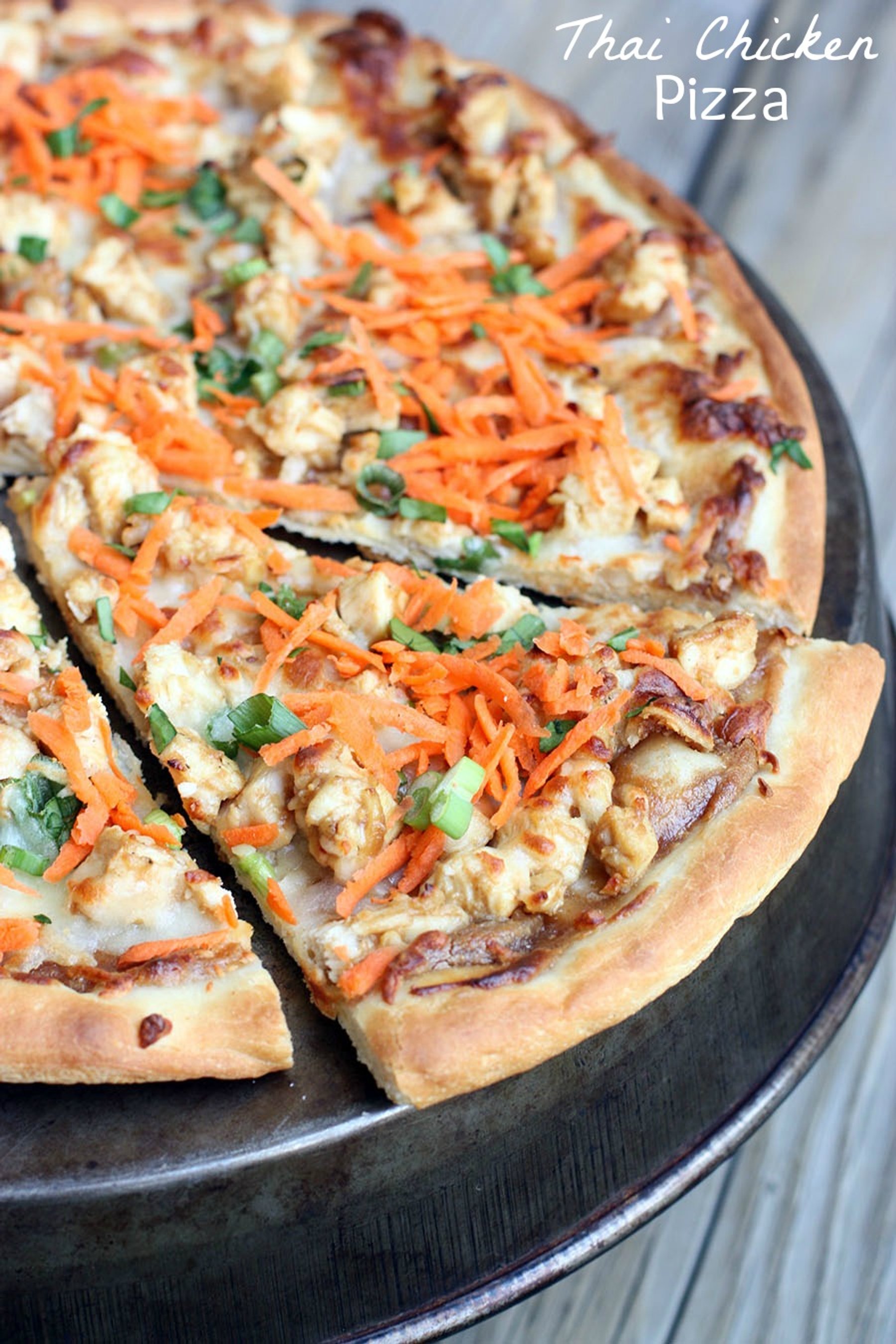 Thai Chicken Pizza is one of my favorites! My favorite homemade pizza crust smothered with a Thai peanut sauce and topped with chicken, cheese, onion, cilantro and carrots. The flavors are amazing!