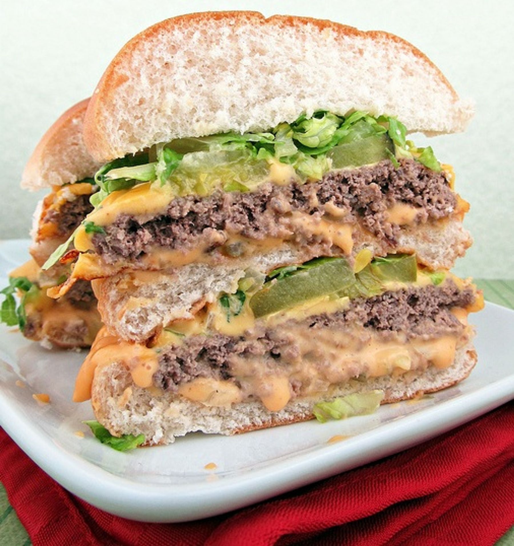 To assemble burger slather half the sauce over one of the bottom buns, sprinkle with half the onion, top with lettuce, a burger patty, pickles then another bottom bun; repeat and finish with the top bun.