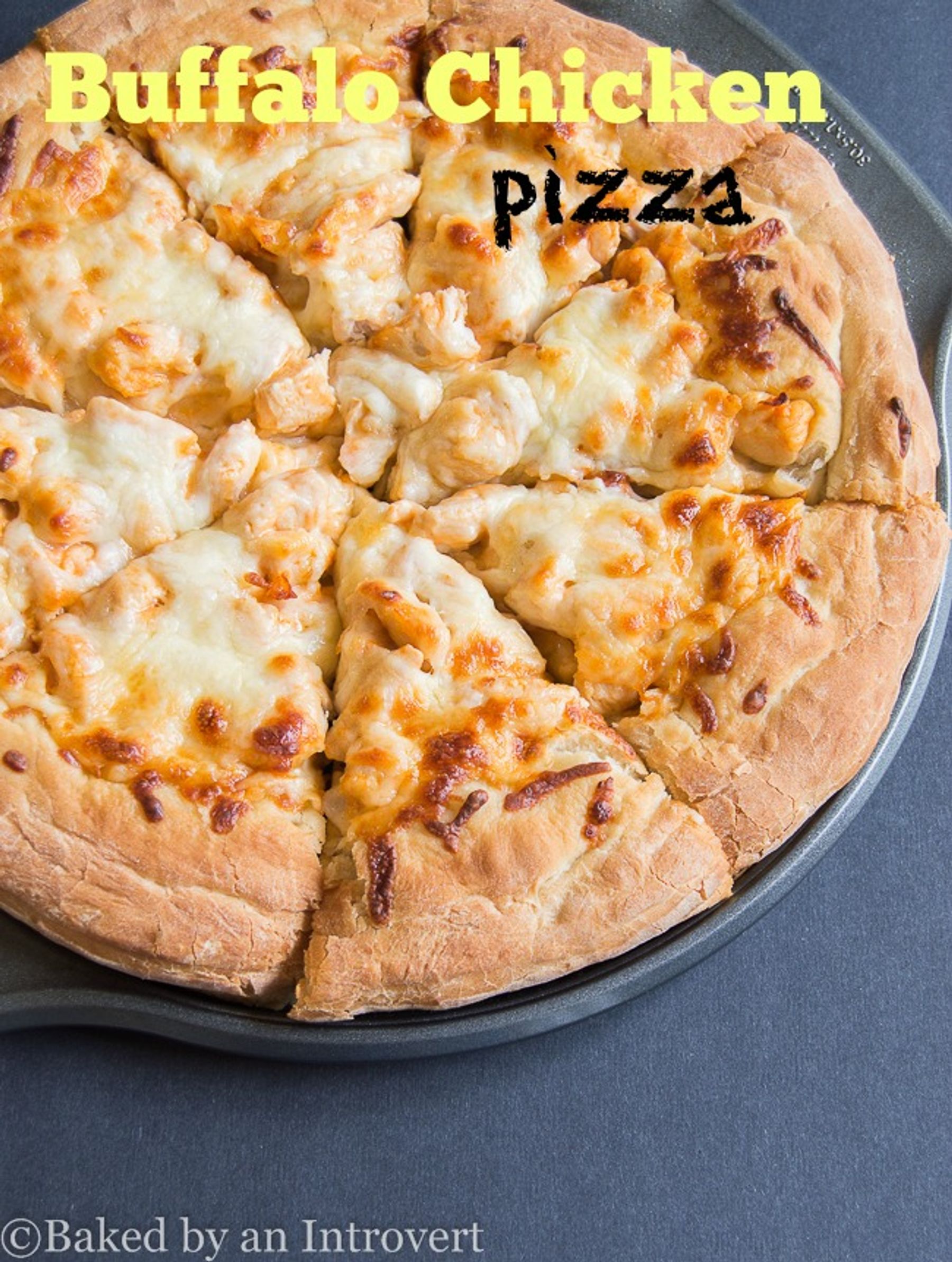 Thick homemade pizza crust topped with spicy hot sauce, chopped chicken, and loads of cheese. The simplest and tastiest pizza!
