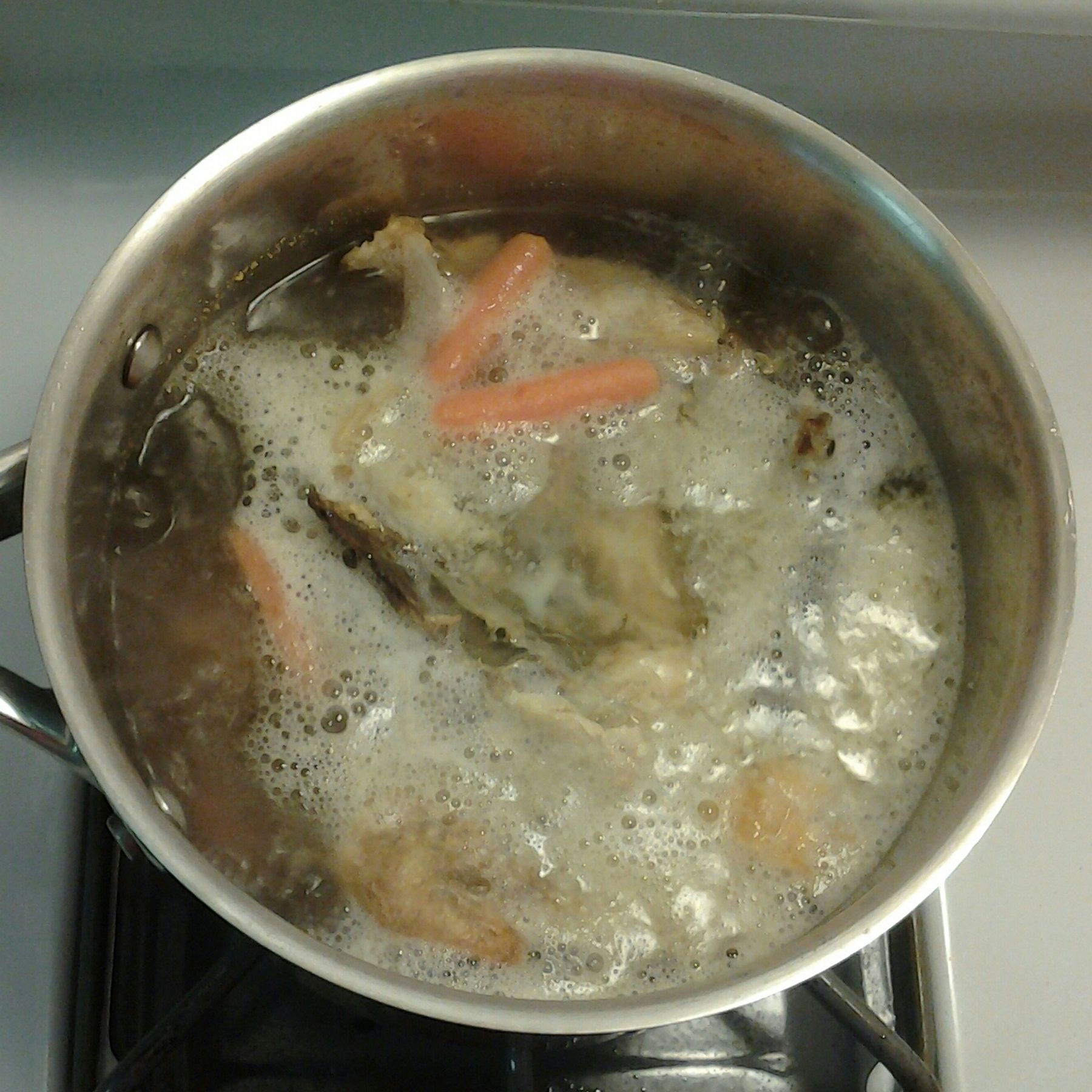 Place your picked chicken bones in a large pot. Fill with water so that is covers the bones. Add the carrots and onion powder. Bring to a boil over medium heat. Reduce h eat to low and simmer for 2-3 hrs....