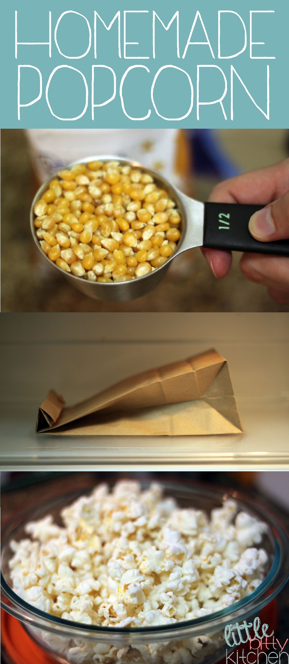 Pour half a cup of kernels into a paper bag, fold the top down twice & lay flat in a microwave. Set microwave & wait until popcorn slows to 5-10 seconds apart. Add toppings to your liking.