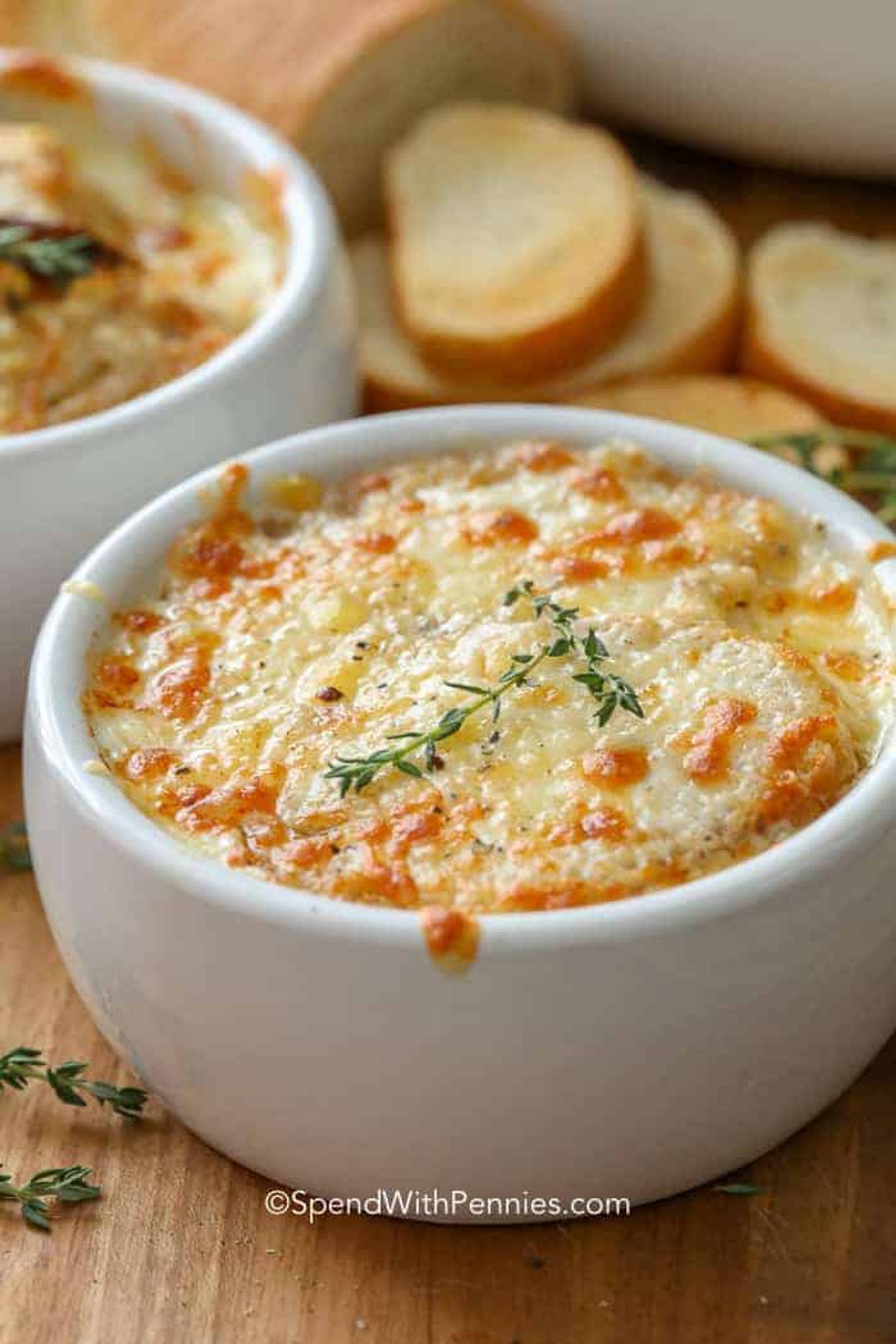 The best part of any french onion soup is the cheesy topping! A crusty bread crouton (or two) is topped with cheese and broiled until golden and bubbly! Who could ever resist?