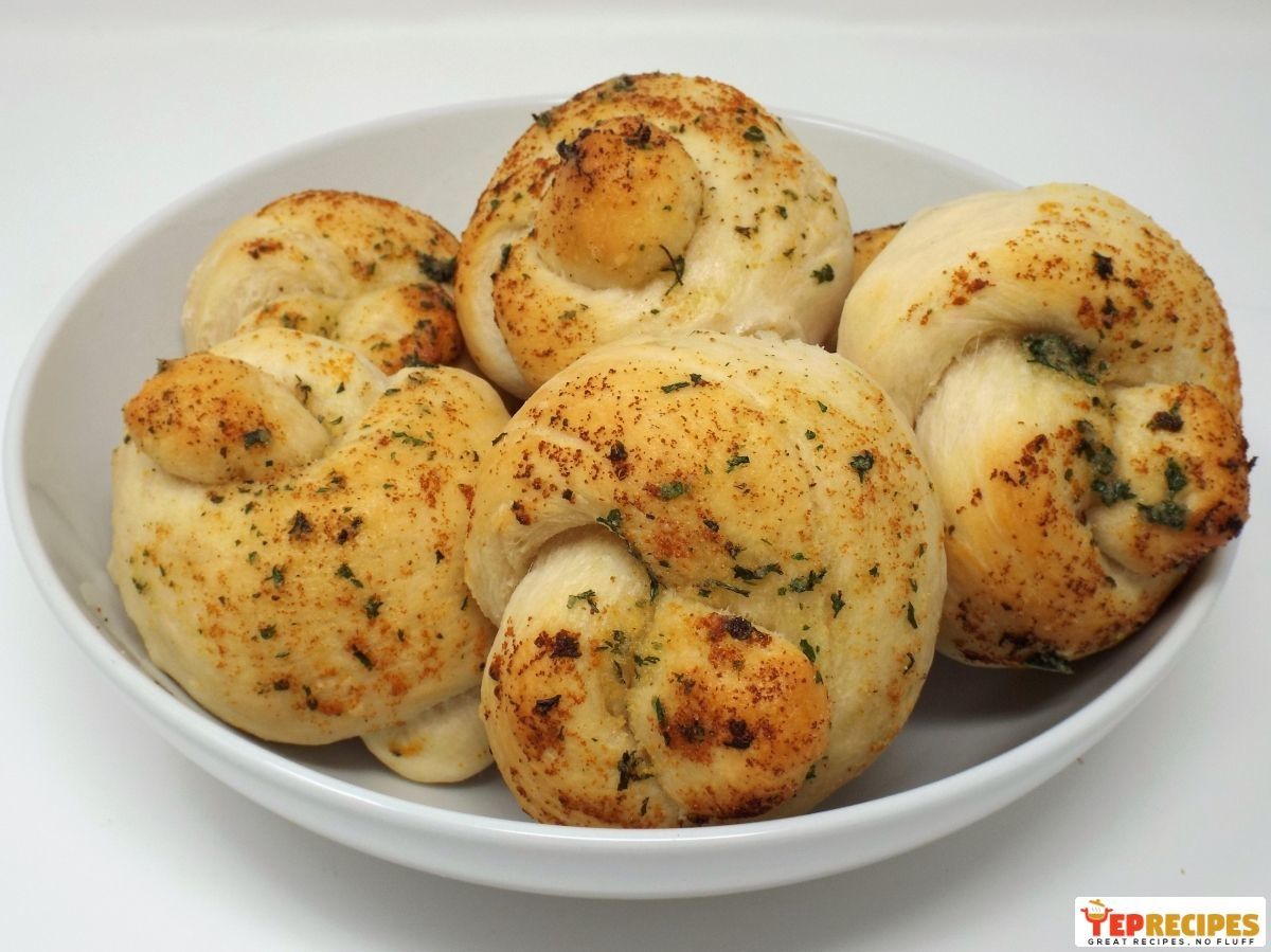 Individual knot shaped breads made from scratch and brushed with a garlic and parsley butter.