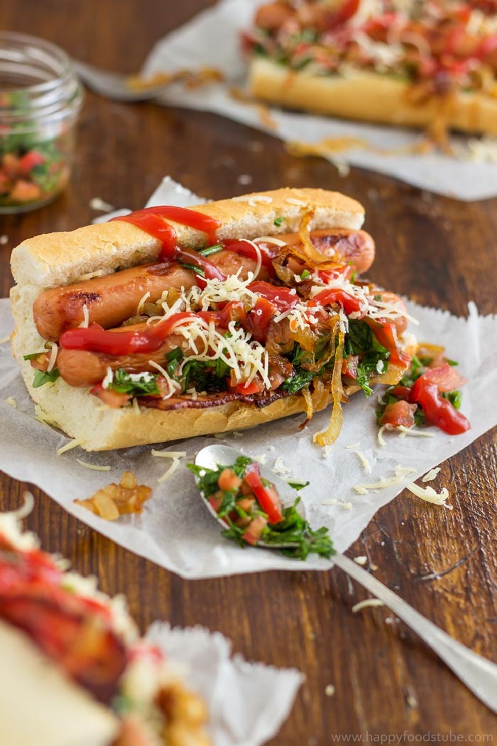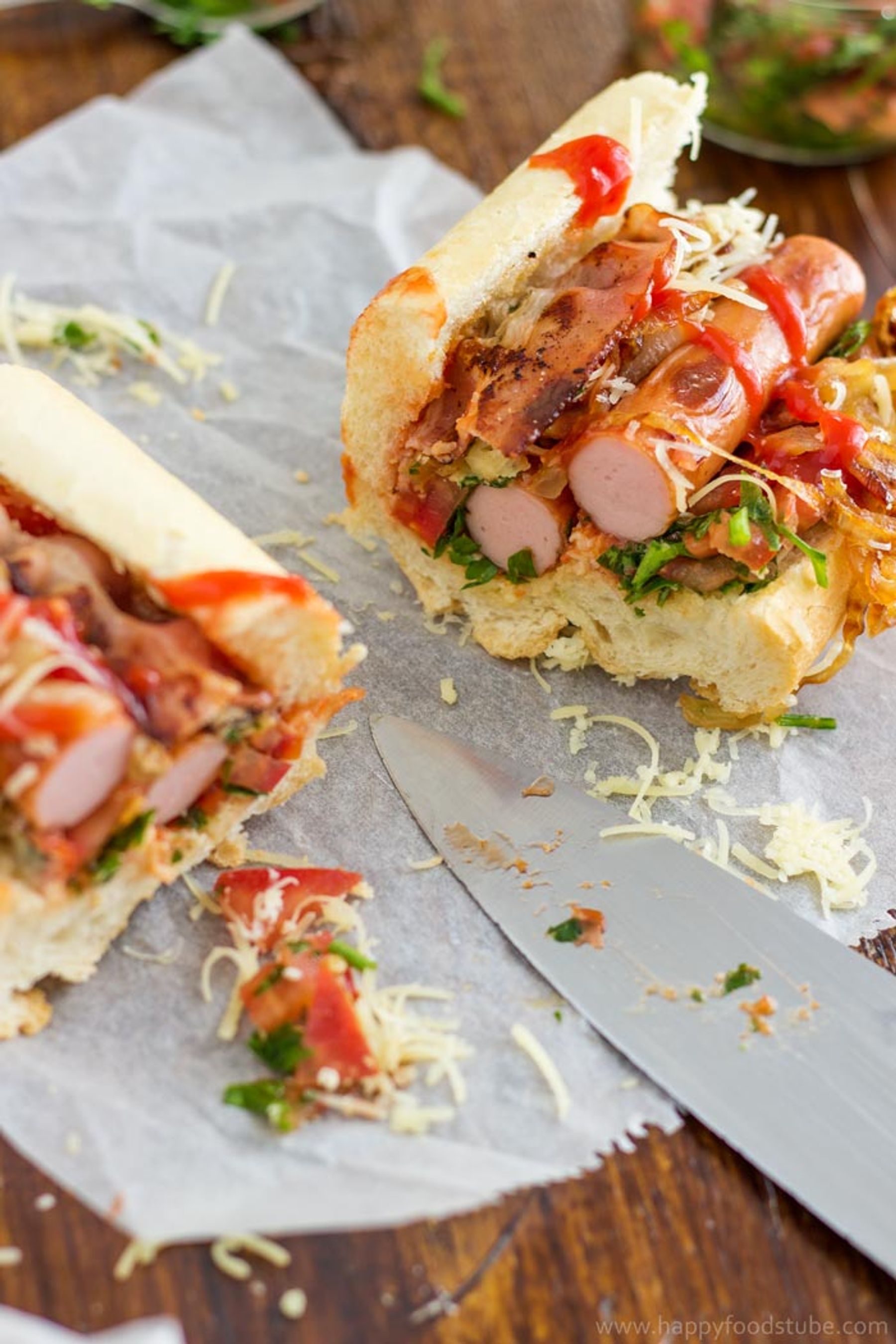 Homemade hot dog with bacon and salsa, topped with caramelized onions & cheese is a dream come true for your taste buds!