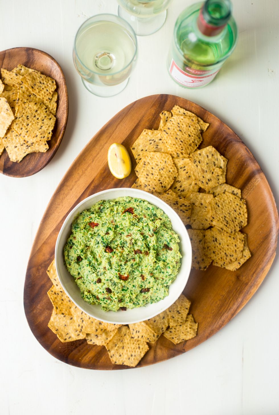 This quick and easy, vegan homemade hummus features kale pesto and sun dried tomatoes. It’s a healthy, gluten free appetizer for entertaining!