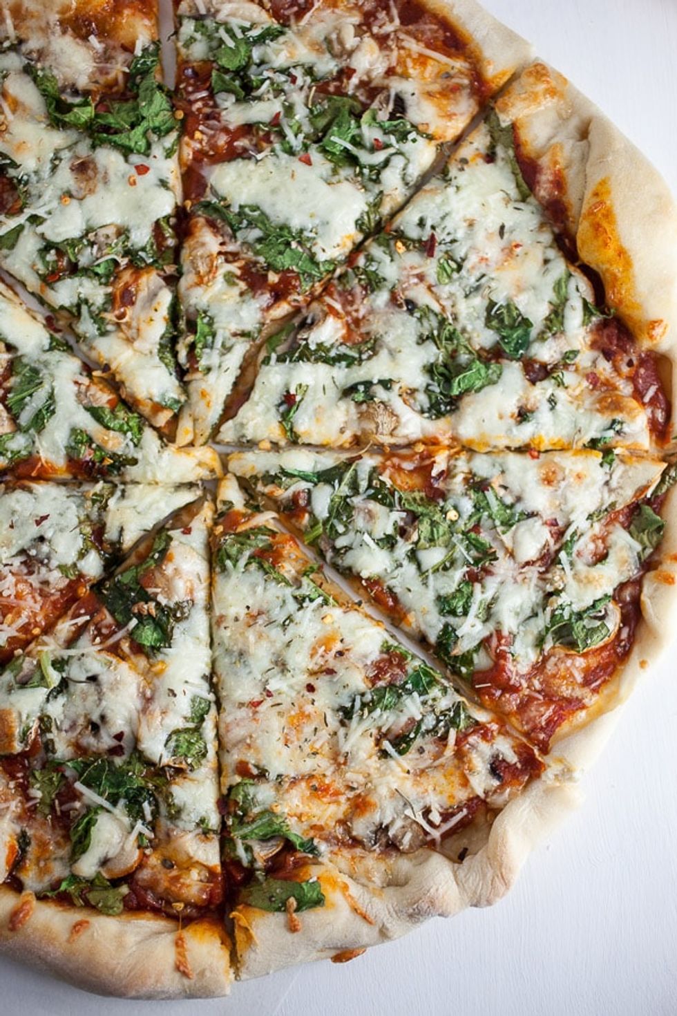 A fresh and flavorful homemade pizza recipe that's topped with earthy mushrooms and zesty arugula then finished with Romano cheese and Italian spices.