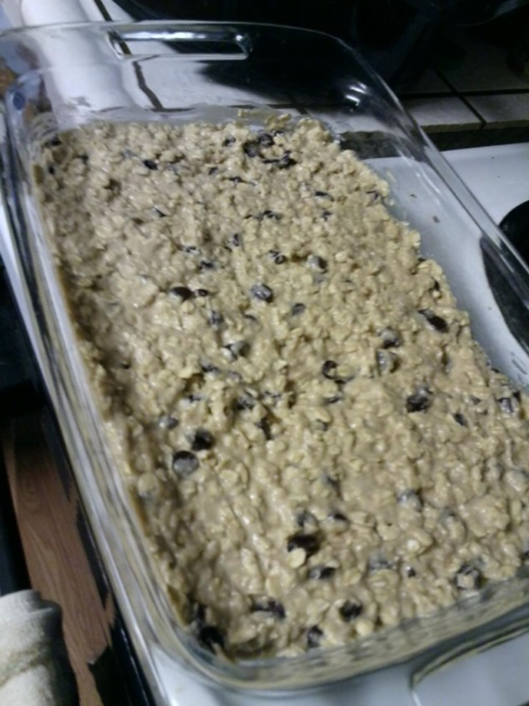 4. Put the mixture into a 9?x13? pan and pat until even. Bake in the oven for 20-30 minutes or until middle is firm to the touch. Take out and cut into desired sized bars and transfer to a cookie sheet. Then put back in the oven and bake an additional 20 minutes or until golden around the edges. Eat within a few hours or wrap in plastic wrap and put into freezer.
