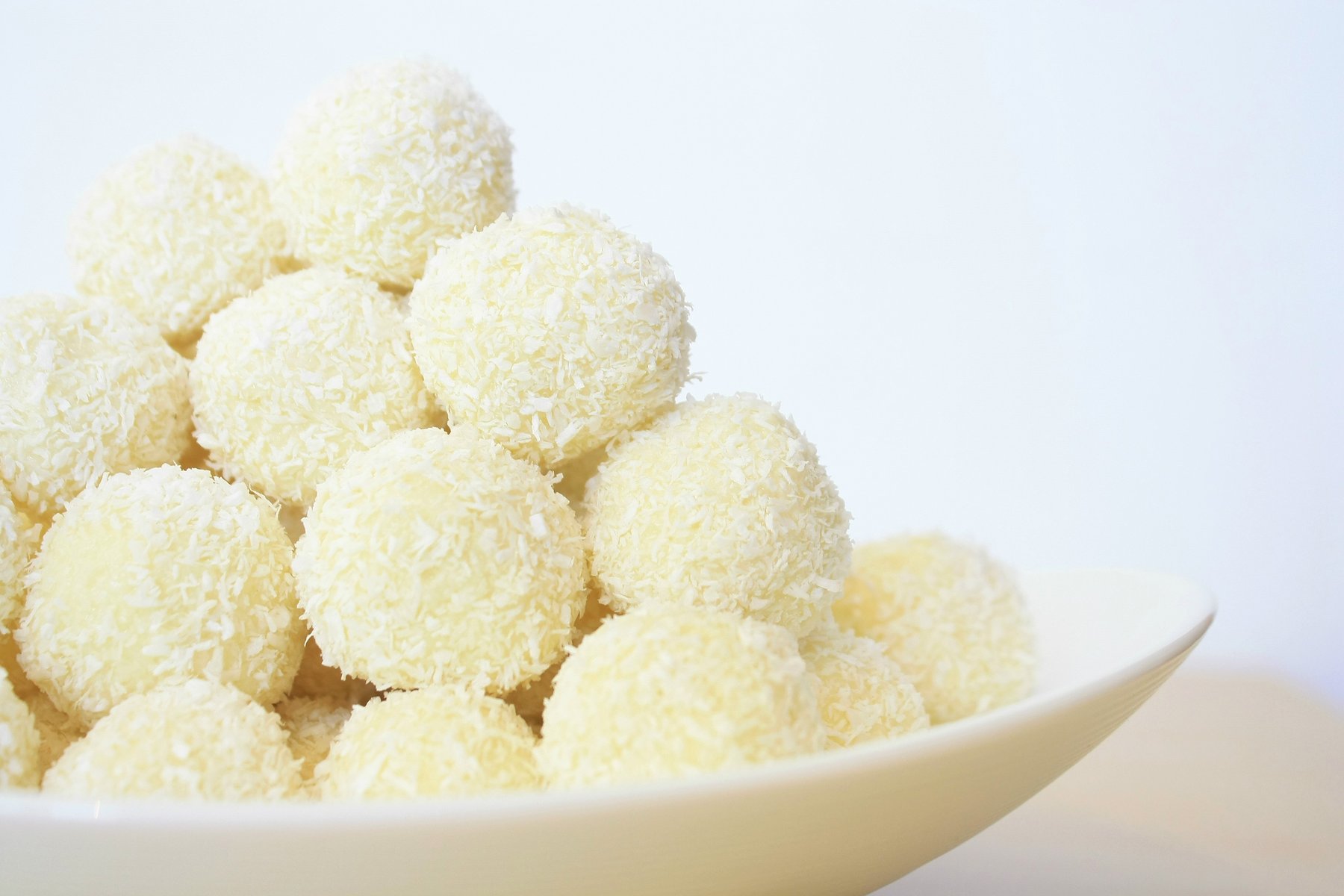 First, melt the butter and add the sugar on low heat. When the sugar is melted, turn off the heat, and stir in the powdered milk. Then add 150 grams of coconut flakes and mix well. Mold \\\"dough\\\" balls...