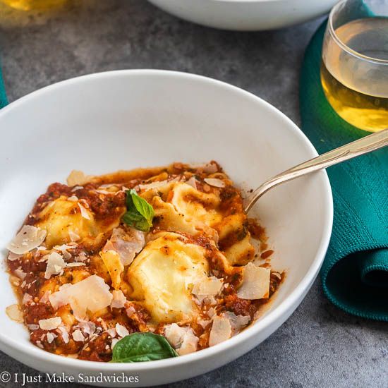 Homemade ravioli filled with ricotta cheese, tossed in a tomato sauce, garnished with shaved parmesan and fresh basil