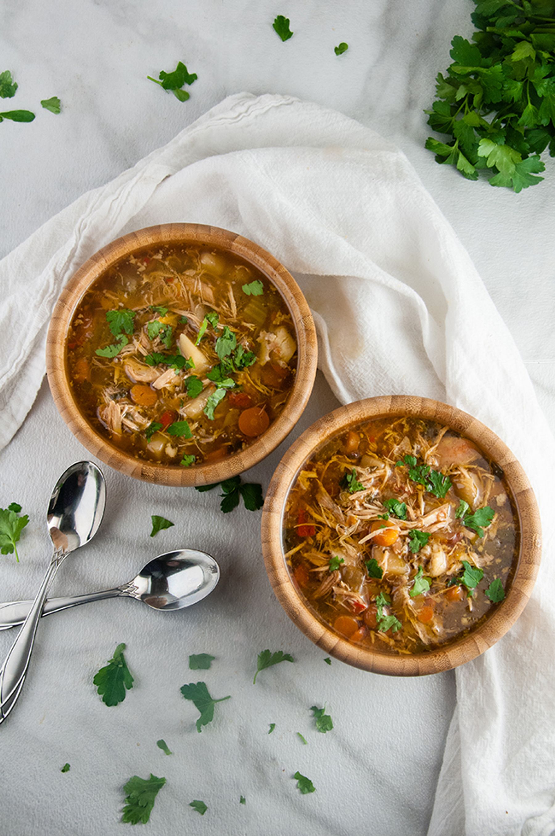 Put the whole chicken, onion, celery, carrots, bell peppers, potatoes, tomatoes into a large slow cooker.Cover with cold water to cover by 1-2 inches. Add the parsley, garlic, bay leaves, red pepper flakes,...