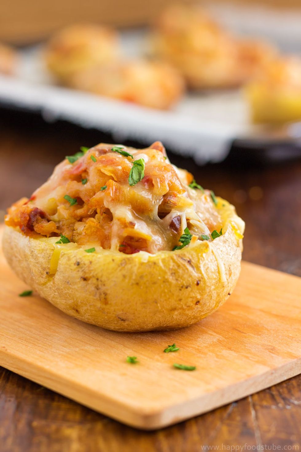 Twice baked potatoes with chorizo & topped with cheddar can be enjoyed as an appetizer, side dish or a main!