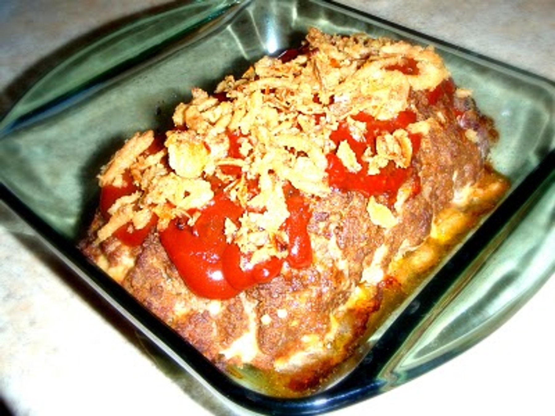This meatloaf isn't just your ordinary meatloaf! Yes, it tastes like a traditional meatloaf, but with an extra crunch from the french fried onions and zing sauce on top sets it apart from traditional meatloaf! It's fairly easy, if you don't mind getting your hands a little dirty!