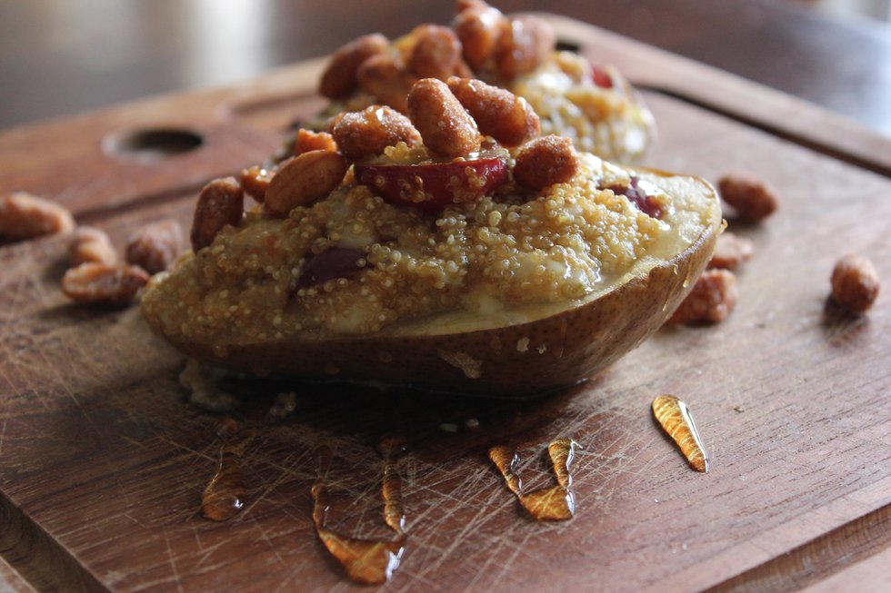 I don't know why, but the idea of baking fruit always intimidates me. I don't really have a reason. People bake fruit all the time. Into pies, pastries, casseroles and other savory dishes. It still makes me nervous every time I tackle it. Today I decided to face my fears head-on. I decided to construct a doozie of a baked pear, stuffed with quinoa, grapes, gorgonzola cheese and honey-roasted peanuts. Sounds like a lot going on, I know, but trust me the sweetness of the honey mixed wit