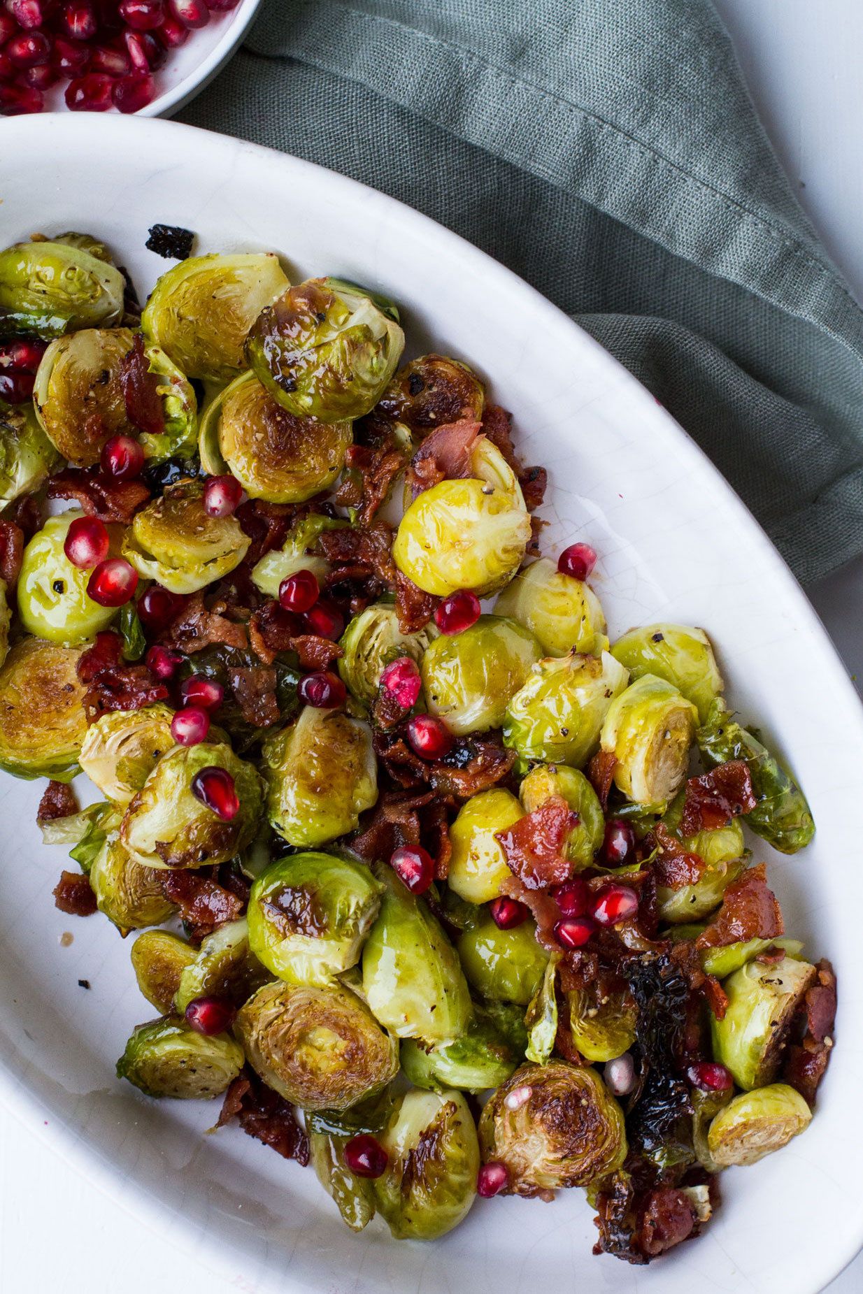 Honey Balsamic Baked Brussels Sprouts sprinkled with bacon and pomegranates for the ultimate and perfectly balanced side dish.