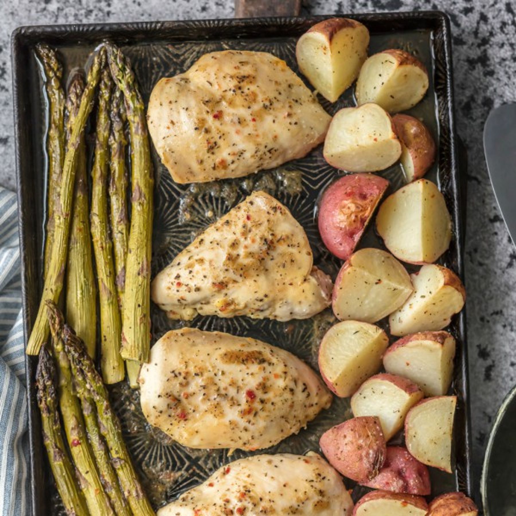This ONE PAN HONEY GARLIC CHICKEN AND VEGETABLES is the ultimate weeknight meal. This easy dinner creates the most tender chicken, potatoes, and asparagus. Bonus, only one sheet pan to clean!